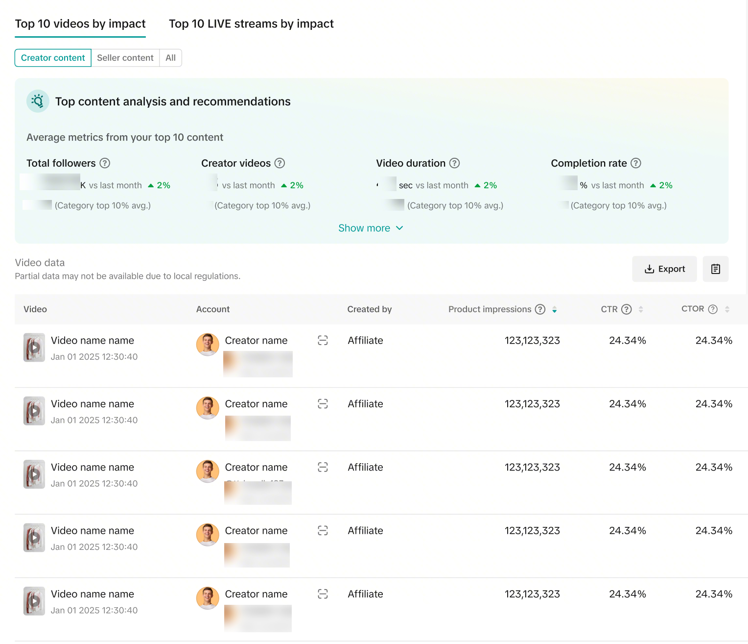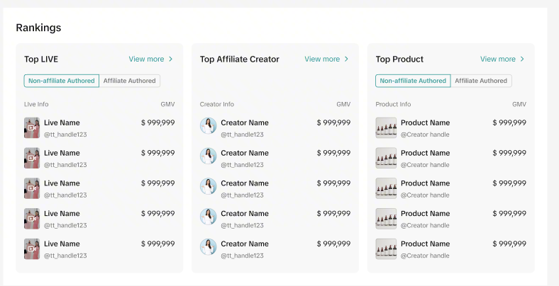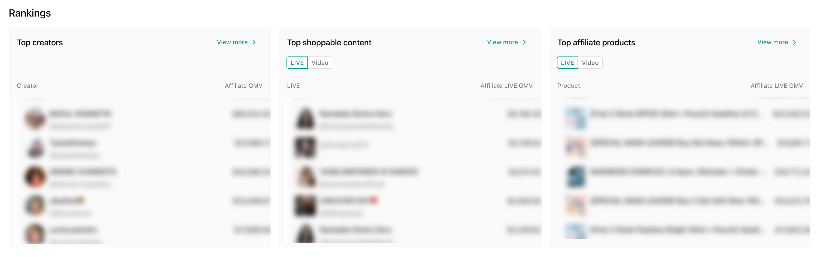 ![]() ![]() ![]() ![]() | – 您可以查看直播/视频、达人以及商品的排名信息: – 内容(LIVE/可购物视频)的排名会区分为卖家内容与达人内容 – 排名顺序基于直播或可购物视频所带来的 GMV 进行排序 – 点击“View more”可查看更详细的数据表,按 GMV 对所有内容进行排名 – 点击任意列列头(如 SKU 订单量、播放量等),可重新排列列表顺序 |