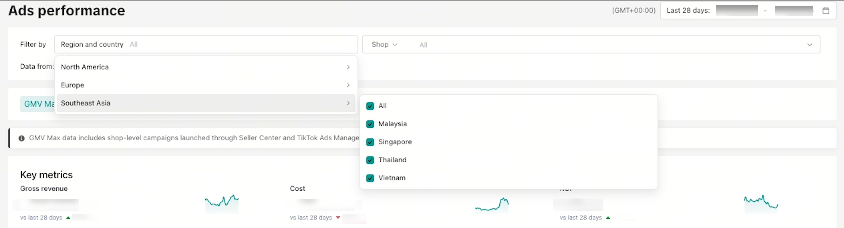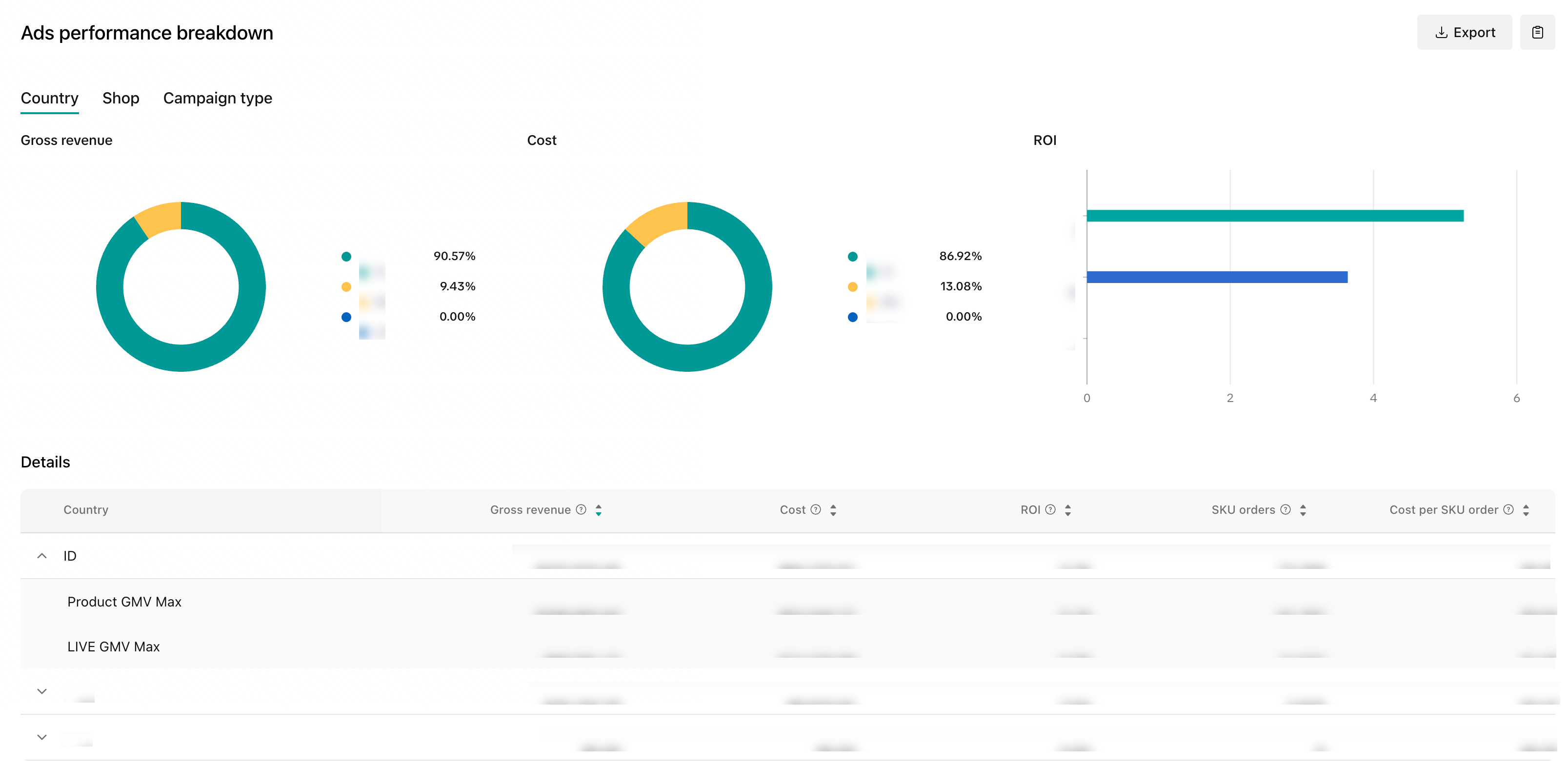 ![]() ![]() | – 广告活动类型分析 – 查看各市场/店铺对整体广告投放的贡献及各自的投放效率 – 比较不同广告类型(LIVE GMV Max,Product GMV Max)的投放表现,从而判断在不同市场哪种广告类型更适合该品牌 |