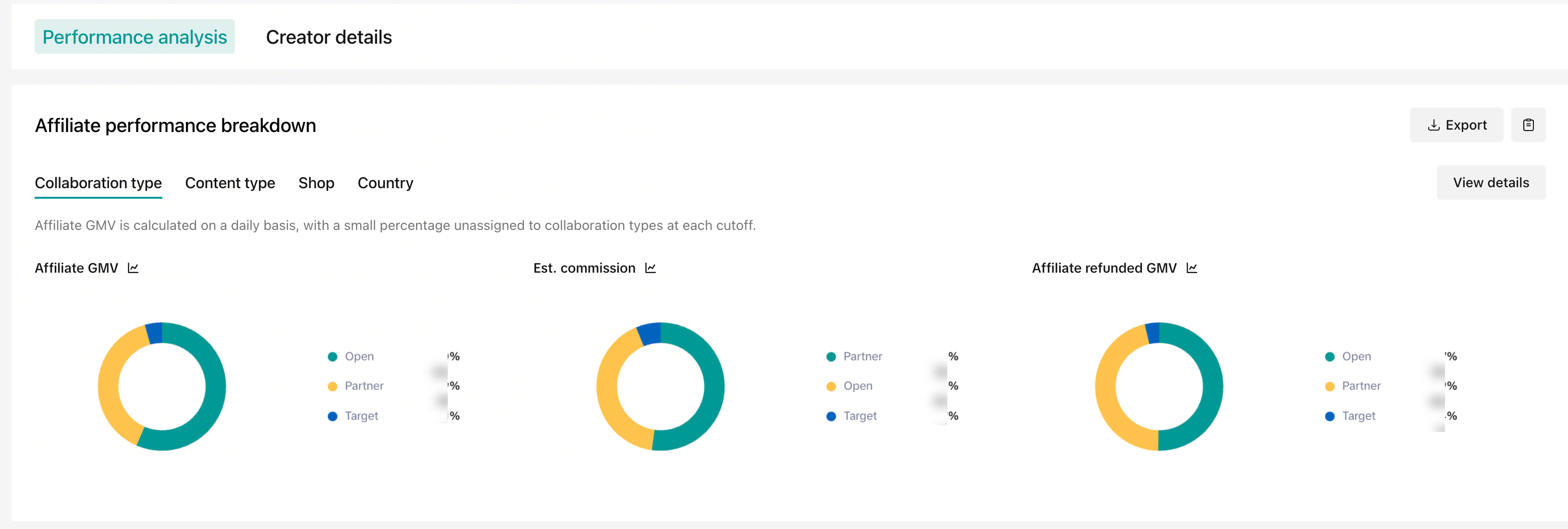 ![]() ![]() | – 对比分析 – 从四大维度拆解联盟表现: – 协作类型(open plan、target plan、partner campaign) – 内容类型(LIVE、Video、Product card) – 店铺层级对比 – 市场层级汇总 – 除内容类型外,还会根据协作类型或内容类型进一步细分,帮助深入了解数据。 |