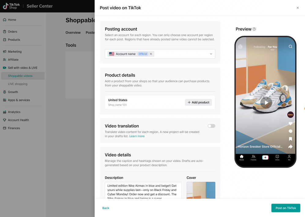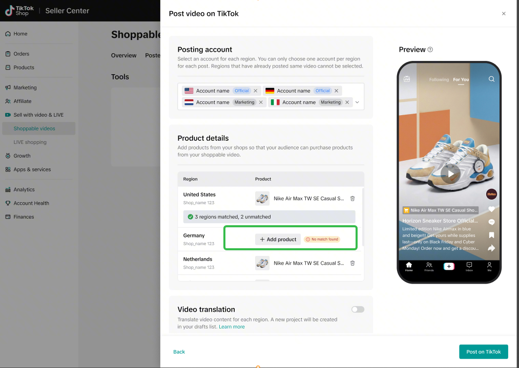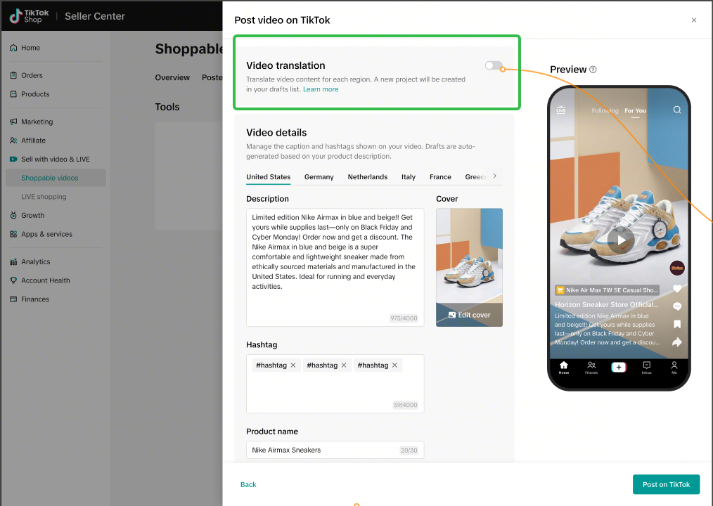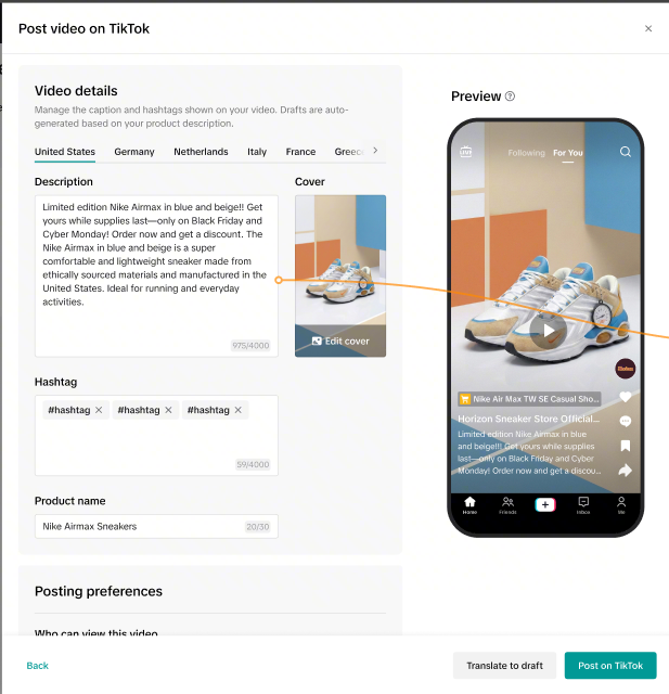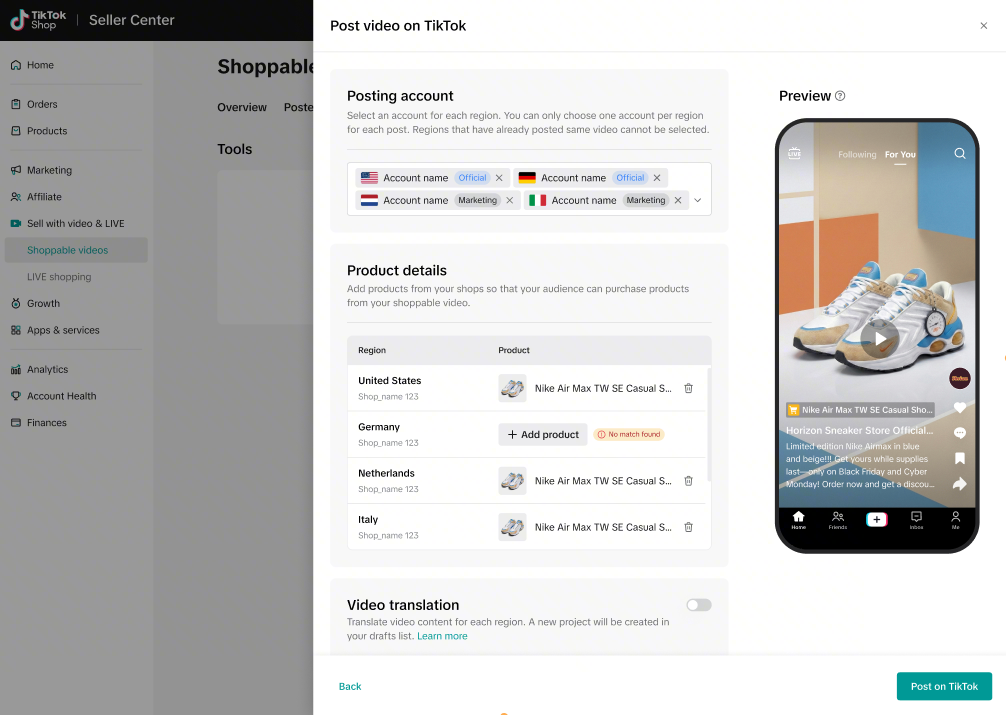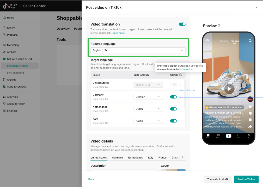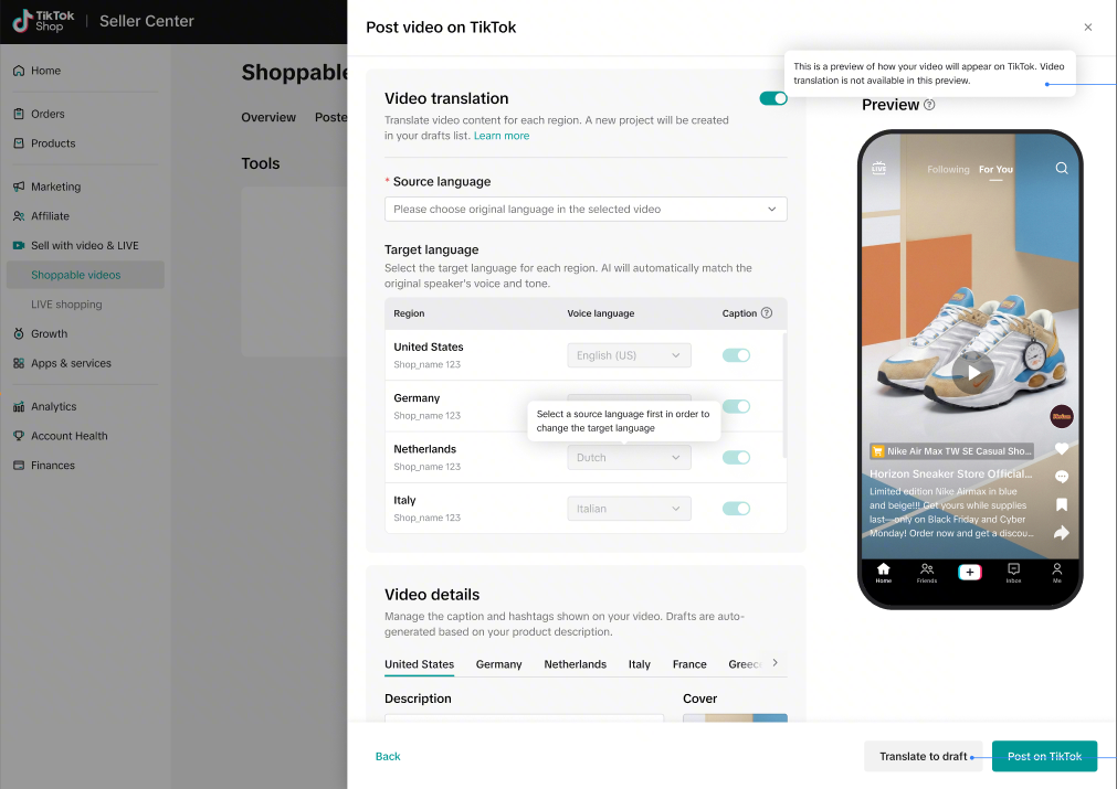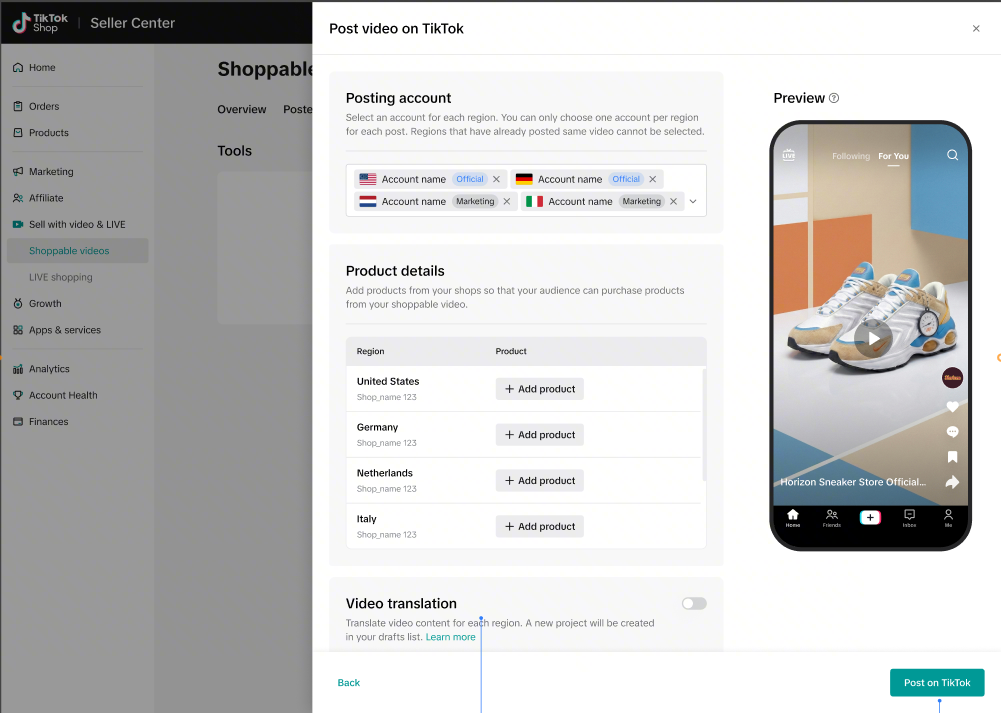 多国内容发布,支持商家在一个店铺后台发布、管理不同主体下所有已绑定店铺的商家短视频;商家可以自行在后台选择需要发布的国家、账号,绑定该国账号下的商品,并使用后台的自动翻译功能快速实现视频的转译,一键发布到多个目标国家账号。(已优先支持“内容从美国一键发全球”,4月下旬将支持任意区域可发全球)