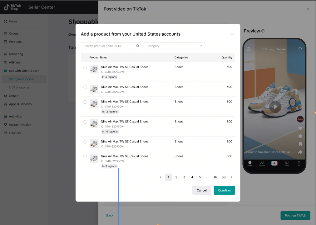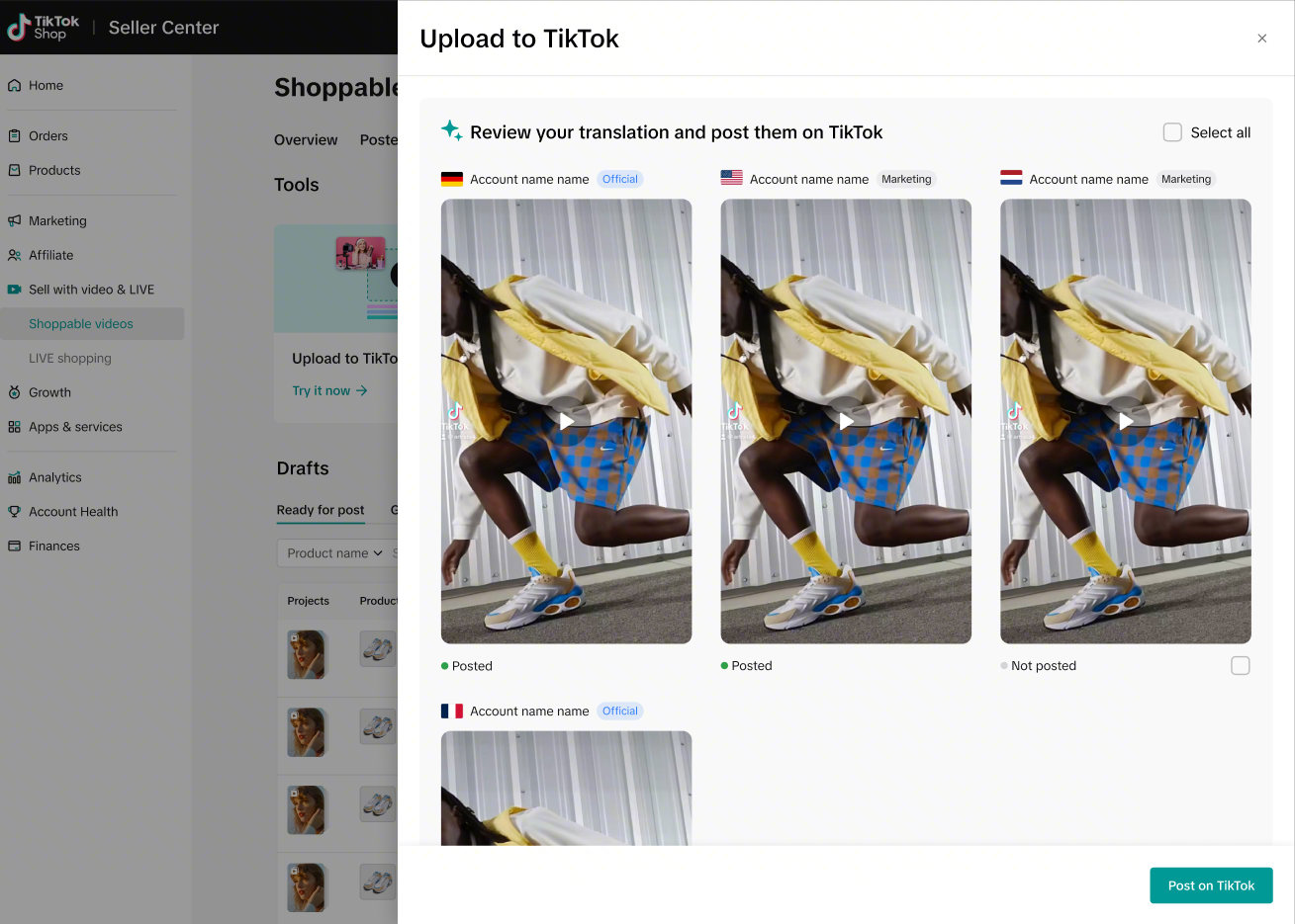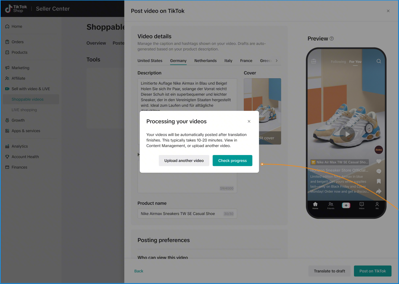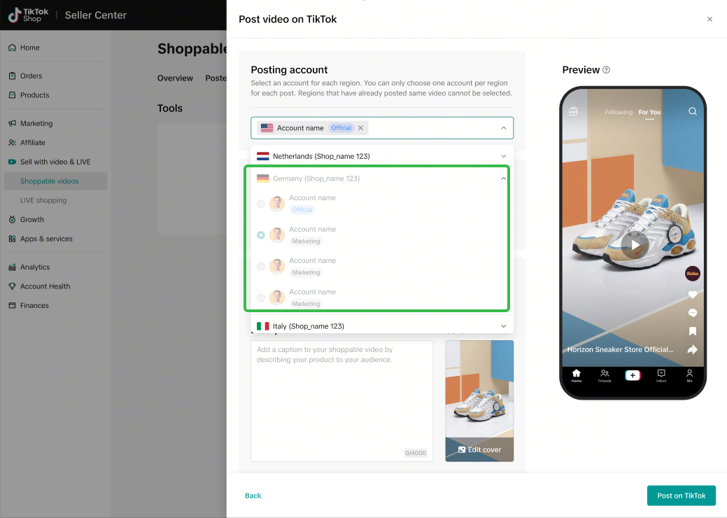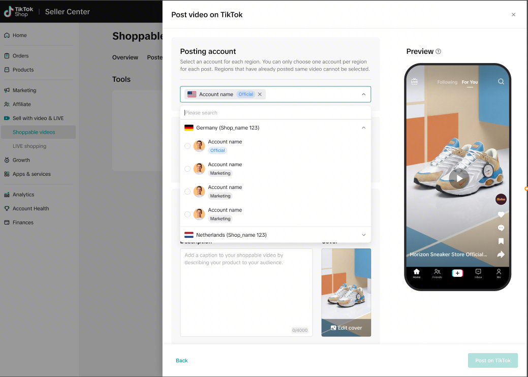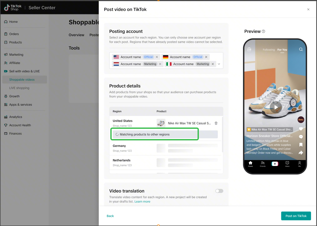 多国内容发布,支持商家在一个店铺后台发布、管理不同主体下所有已绑定店铺的商家短视频;商家可以自行在后台选择需要发布的国家、账号,绑定该国账号下的商品,并使用后台的自动翻译功能快速实现视频的转译,一键发布到多个目标国家账号。(已优先支持“内容从美国一键发全球”,4月下旬将支持任意区域可发全球)