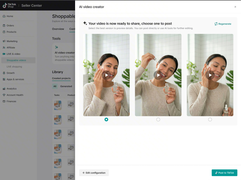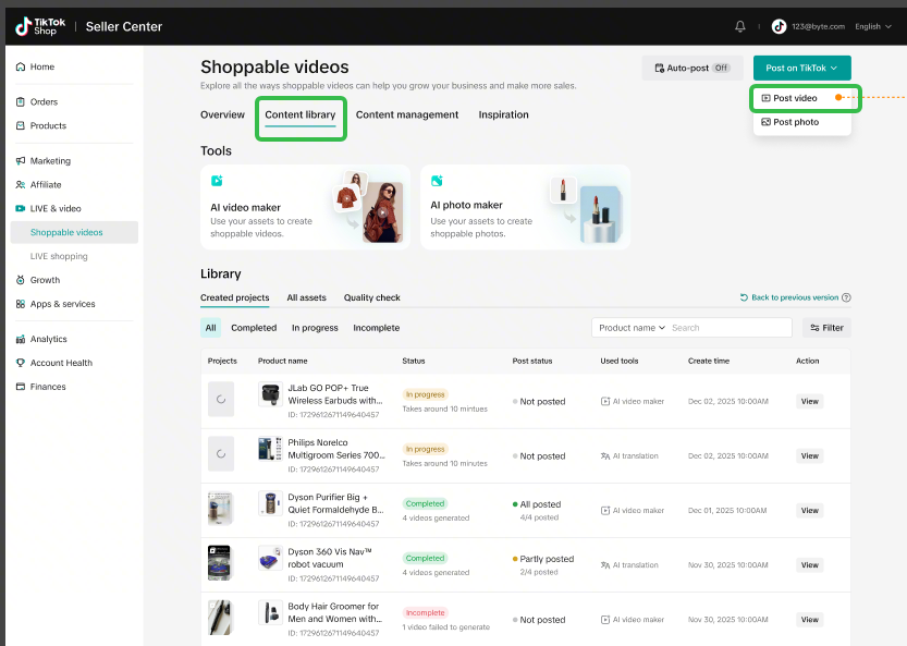 | 1、功能入口 | – 功能入口:SC后台shoppable videos; – 选择【Content library】,来到后台素材管理页面,这里会显示您所有的短视频,含后台直发已发布、AI工具生成中/已生成的全部短视频内容; – 如果您已有制作好的视频内容,可以通过右上角【Post video】发布;如果您需要对AI工具生成的短视频做多国发布,可以直接在AI短视频生成后操作; | ![]() ![]() ![]() ![]() |
