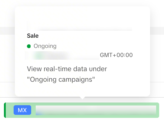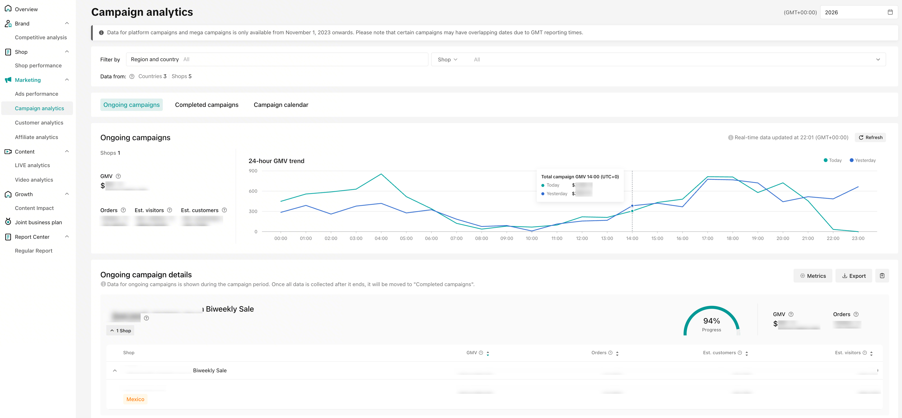 ![]() ![]() | – 大促盯盘 目前在大促中注册的所有品牌和店铺都会显示在这里,并汇总关键指标,包括: – Total GMV – 订单数 – 访客数(查看商品详情页的总访客数) – 购买客户数(支付订单的总人数,包括退货订单) Campaign details: – 活动下拉列表,可查看每个已注册店铺的表现和关键数据 – 可自定义查看指标 – 统览所有正在进行的活动的全球视图 |