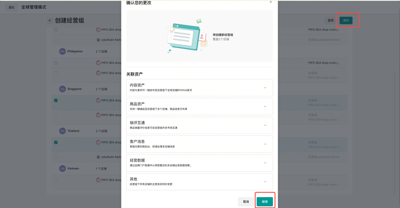 | | Step 4:确认绑定关系 | 点击确认后,系统将弹出确认窗口,同时将自动校验以下内容: – 是否存在重复国家店铺 – 是否主营类目一致 – 是否经营模式一致 校验通过后,经营组绑定成功,您可在经营组内享受相关权益 点击查看权益 ![]() ![]() |