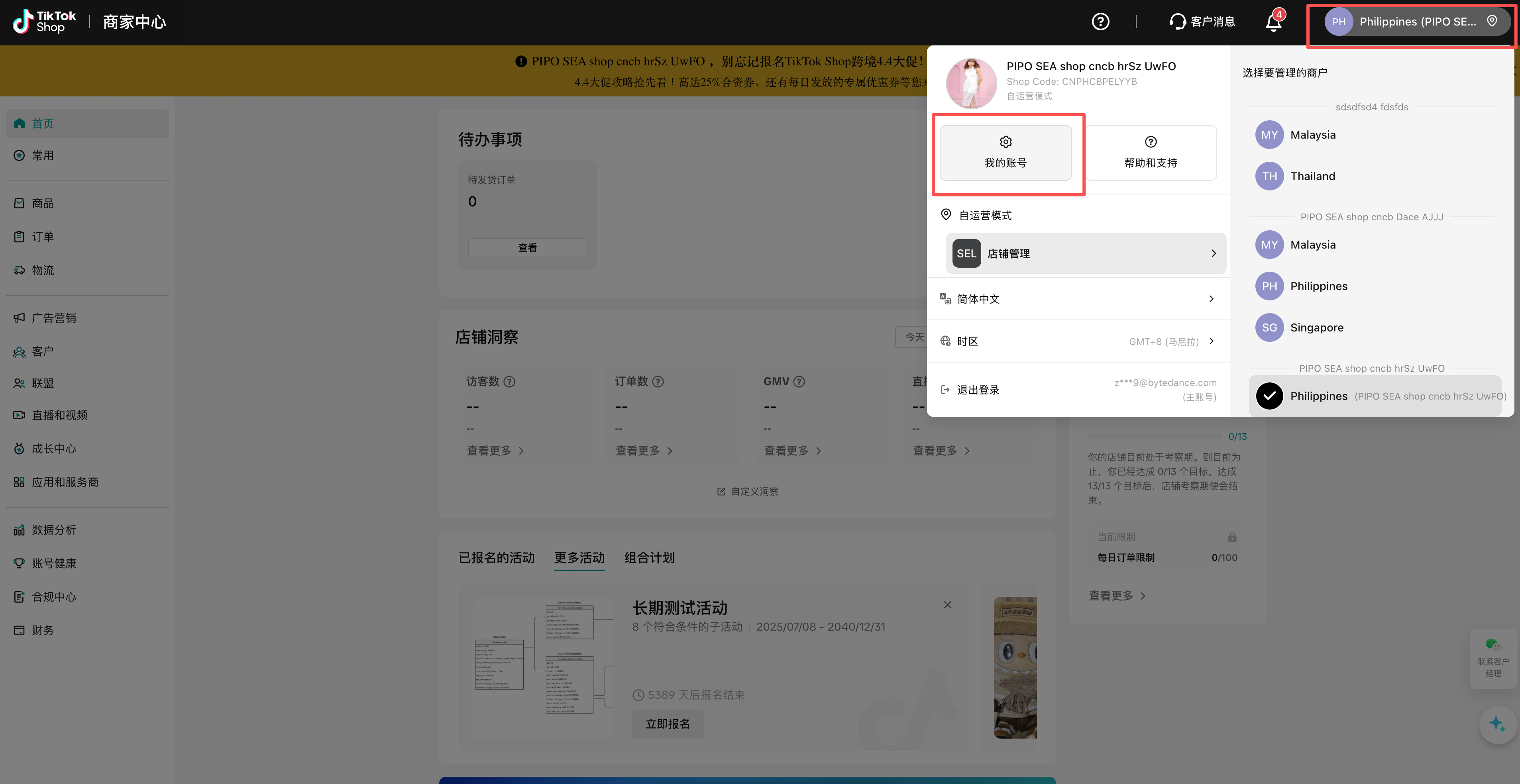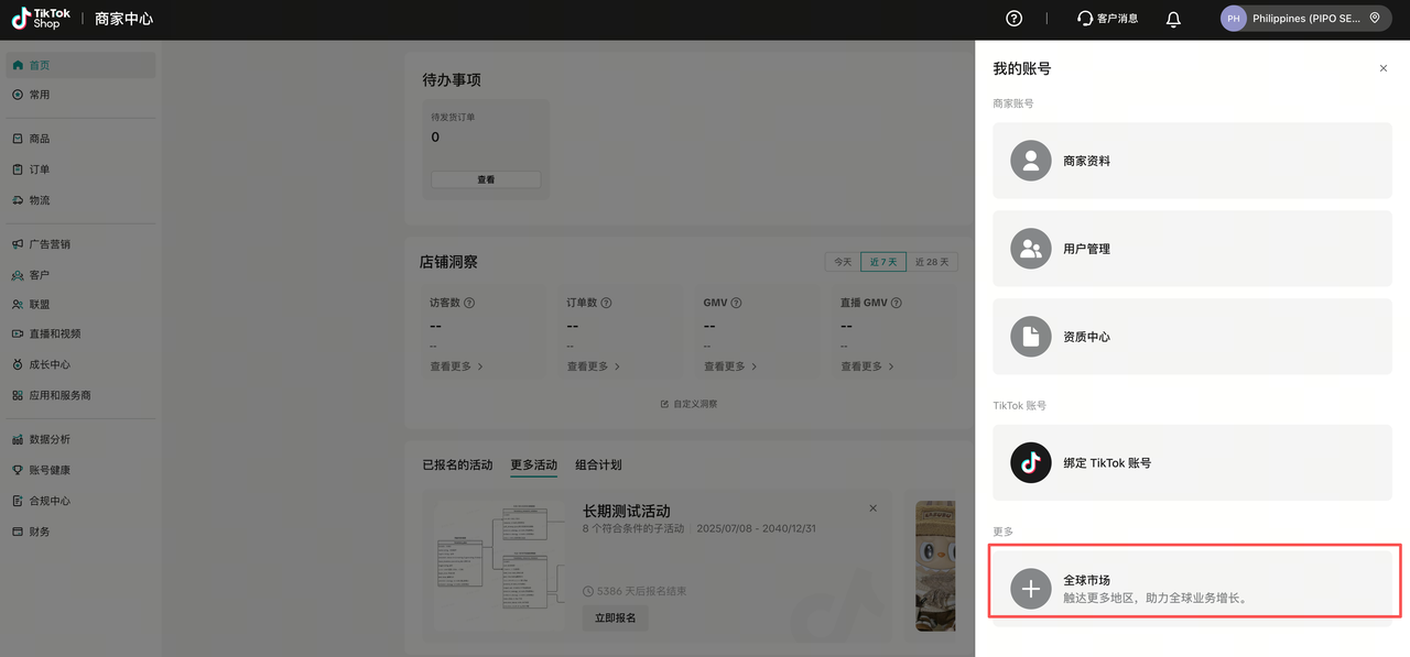 在商家后台导航菜单中,找到并点击 我的账号。在下拉菜单中,选择 全球市场 页面