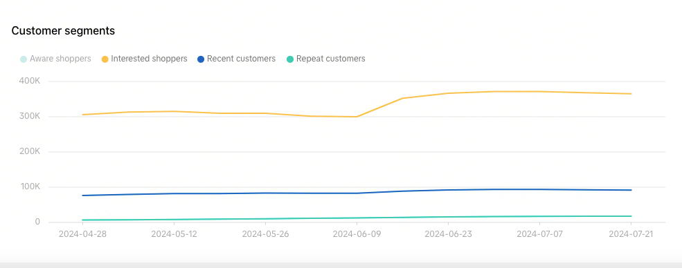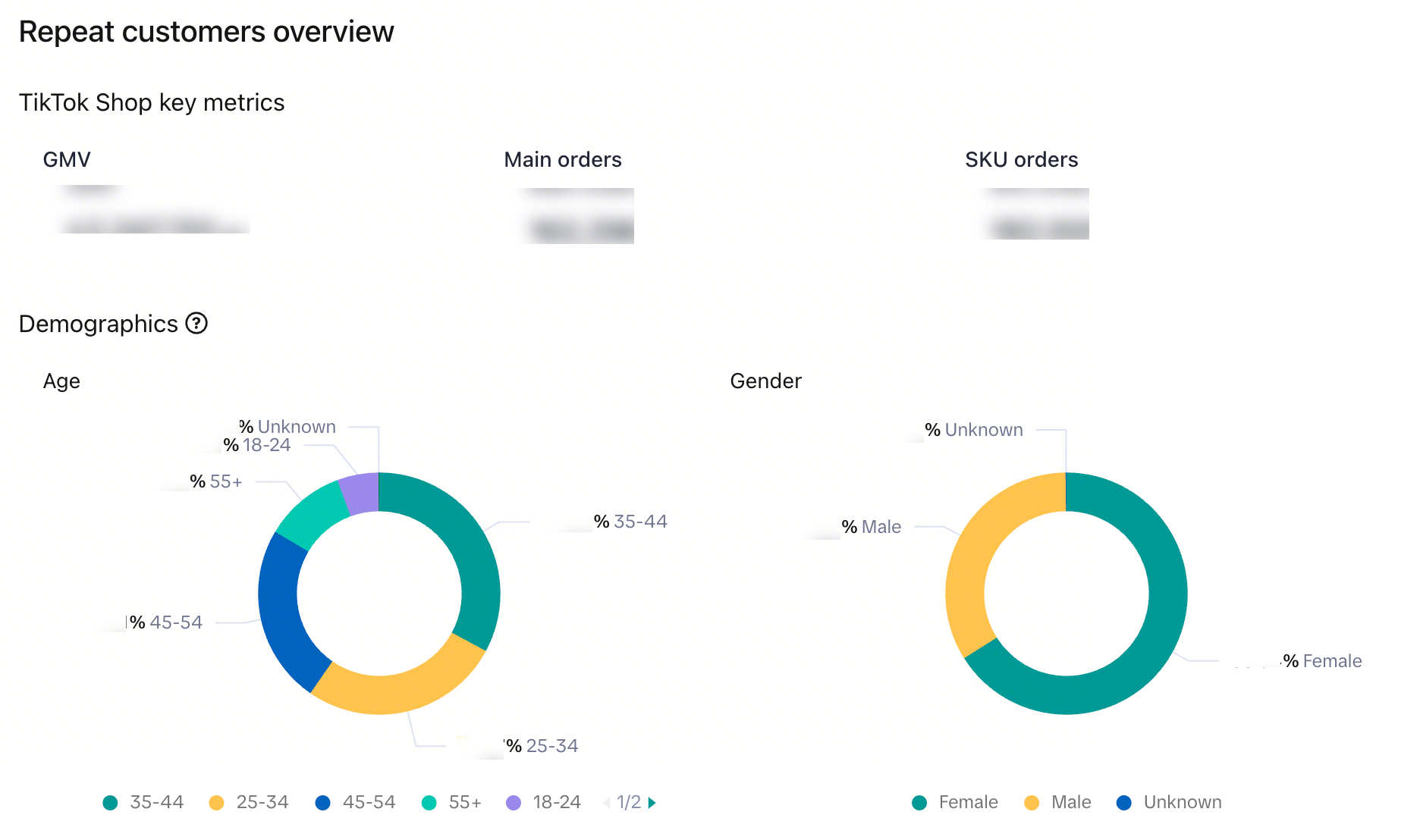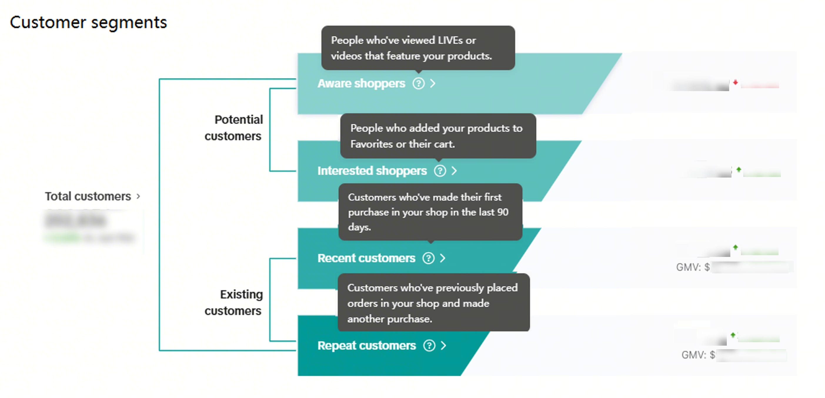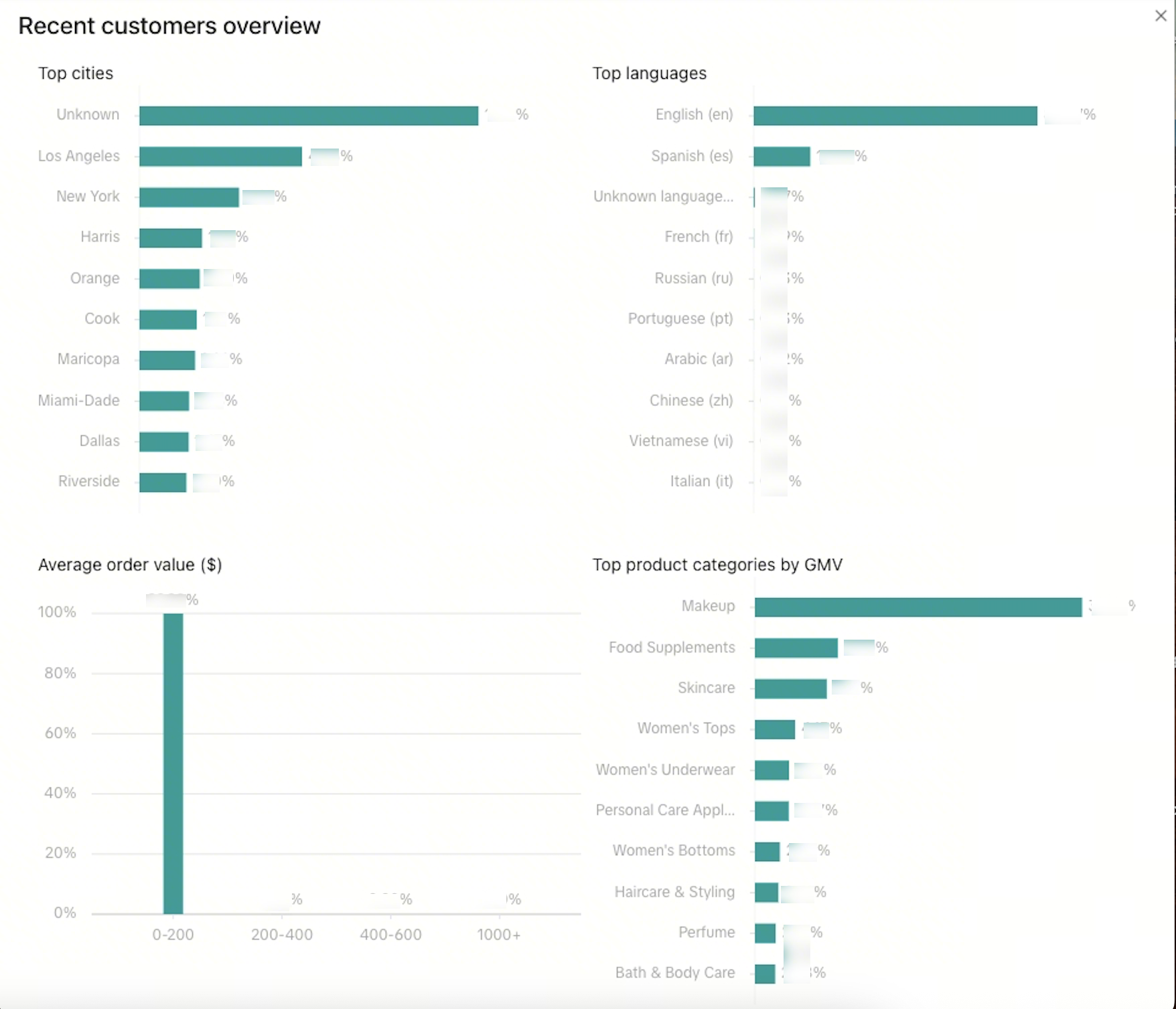 ![]() ![]() ![]() ![]() | – 在合规范围内,针对每个细分(四个分层)提供画像数据 – 年龄:对18岁及以上用户进行细分统计。 – 性别:女性与男性消费者的分布情况。 – 主要城市: – 对于Recent和Repeat customers,基于他们的收货地址统计前十大城市; – 对于Aware和Interested,基于系统估计的地址统计前十大城市。 – 主要语言:根据用户手机系统设置,统计排名前十的语言。 – 平均客单价(美元):在TikTok Shop所有店铺的平均消费金额(不限于特定店铺或品牌)。 – GMV最高的主要商品品类:在TikTok Shop上最畅销的商品品类(不限于所选店铺或品牌)。 |