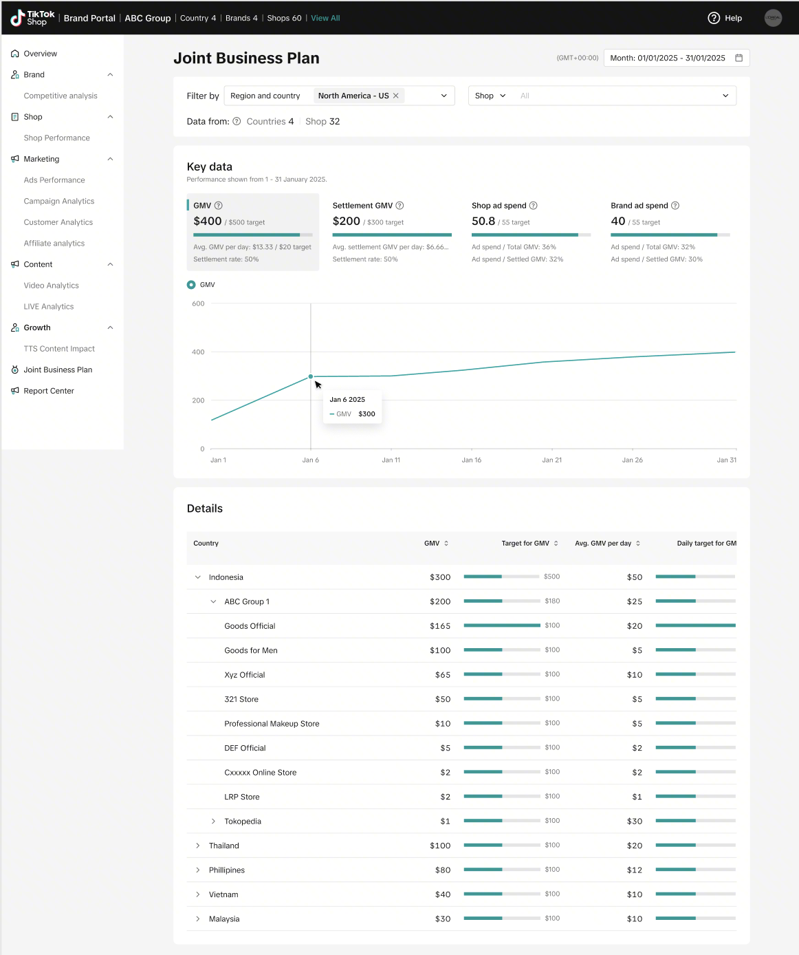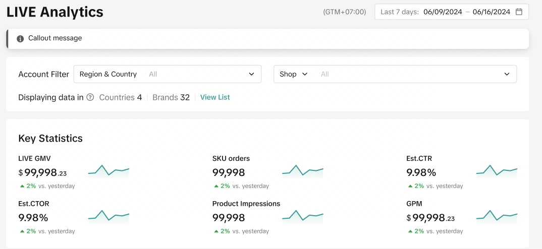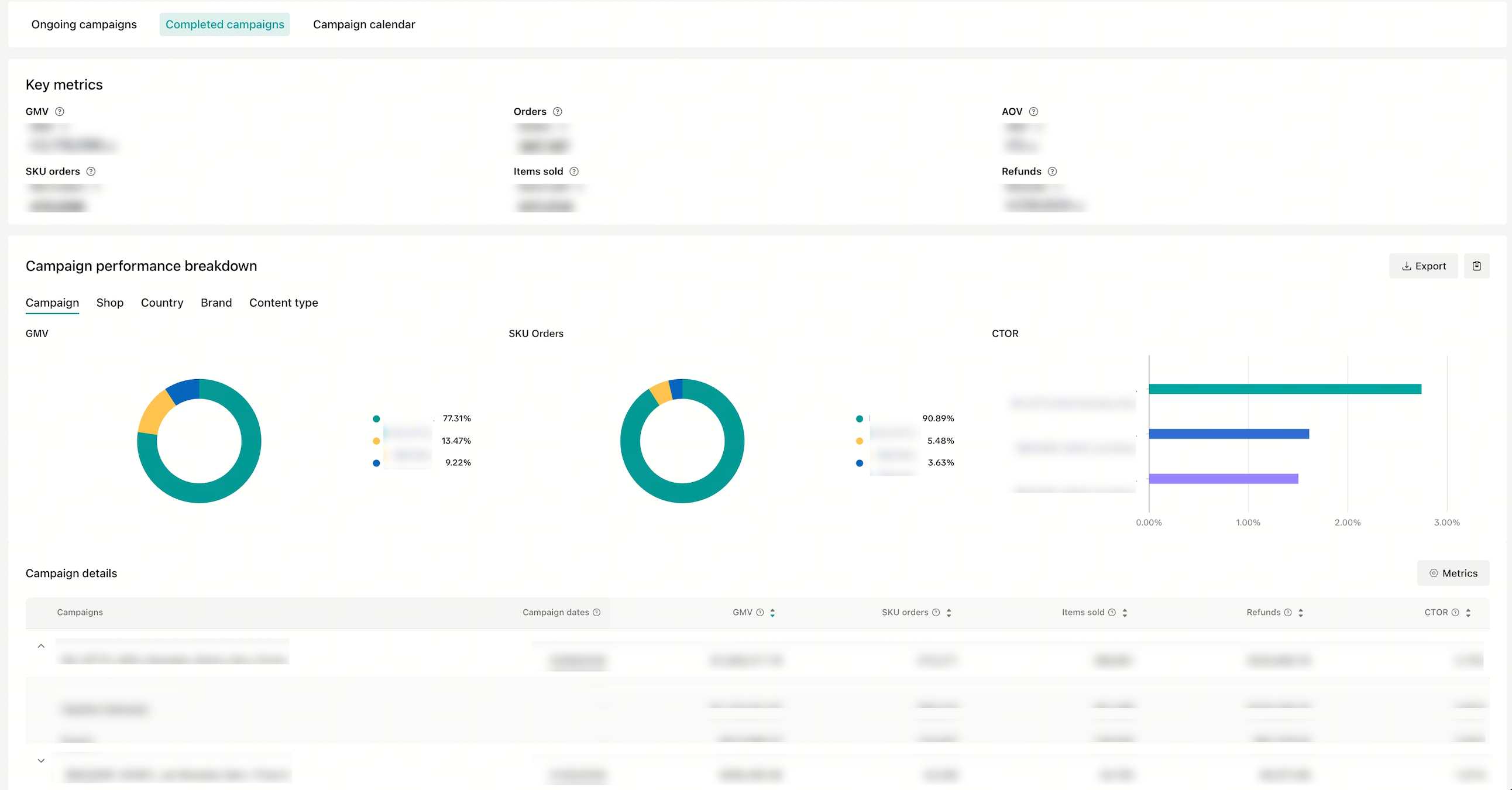 ![]() ![]() | – 历史大促复盘 – 汇总所有已结束的活动表现,支持按区域、市场、店铺筛选,进行多维复盘。 – 汇总数据 汇总所有已结束的活动,支持按地区、市场或店铺进行筛选。 – 对比分析 按活动、店铺、市场、品牌,以及内容类型(LIVE、Video、Product Card)等维度,分别可视化显示 GMV、SKU 订单量和 CTOR(SKU order)的数据表现。 – 详细数据 在活动下拉列表中,您可以查看各注册店铺的表现及关键数据。此模块还提供更多可选指标,并可根据您的需求进行自定义视图。 |