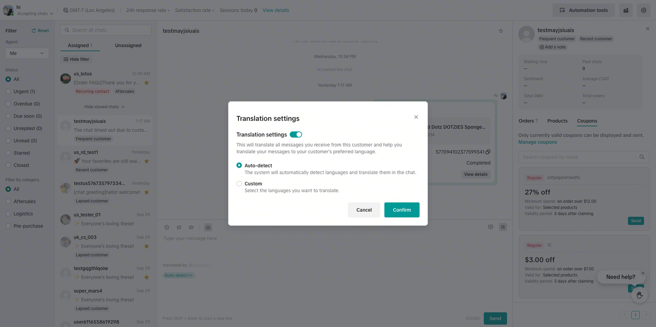 多语言互译:旧版客户消息仅支持客服输入英文,升级后可输入中文和其他语言,均支持相互翻译,帮助您更顺畅地与全球买家沟通。