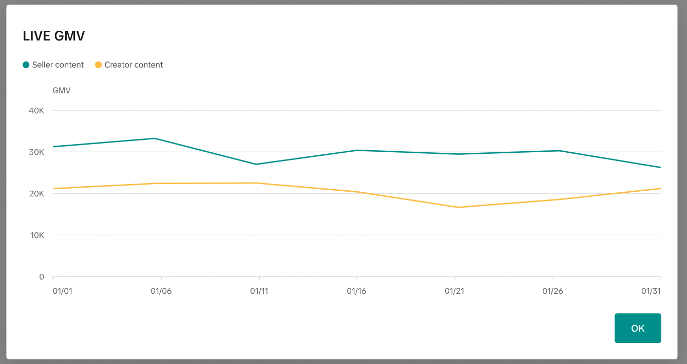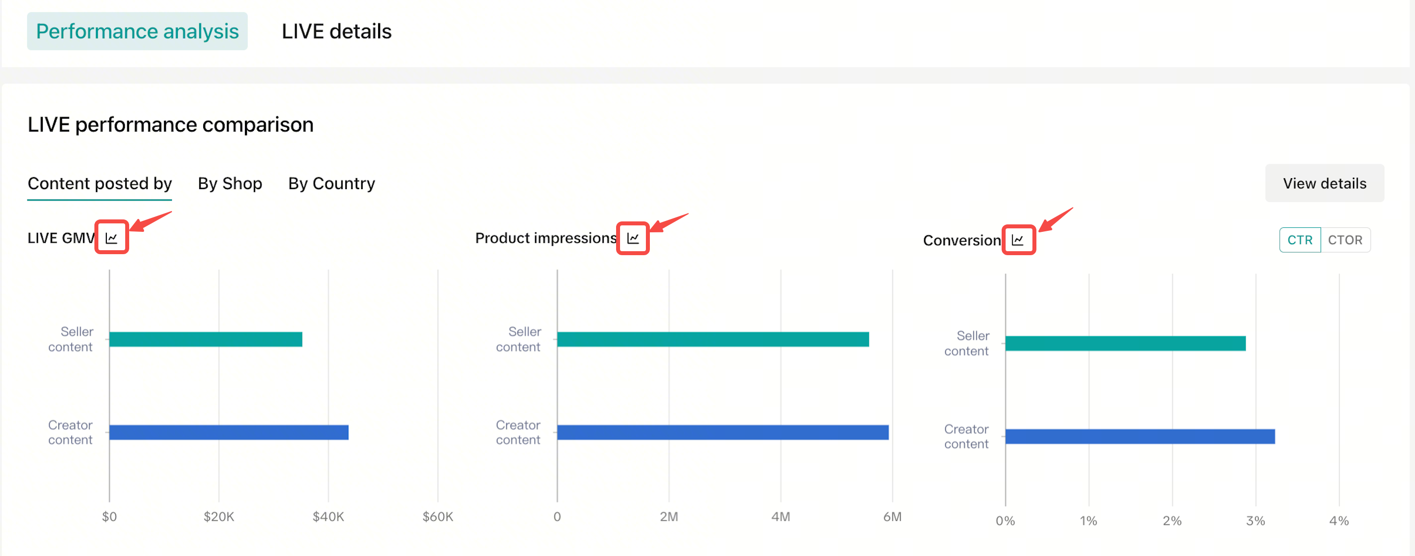 ![]() ![]() ![]() ![]() ![]() ![]() | – 您可以按以下方式拆解直播/视频的整体表现: – Content posted by – Seller content:由商家账号或营销账号创建的直播/视频。 – Creator content:由达人创建的直播/视频。 – By Shop:来自不同店铺的直播/视频。 – By Country:来自不同国家的直播/视频。 – Performance Details – 点击“View Details”,可查看某一特定拆解条件下的详细指标表格,让您对该特定场景的表现有更全面的了解。 – Historical Trend – 点击“trend”图标,可查看相应场景的历史数据趋势图,帮助您跟踪并对比不同时间段内的关键指标变化。 |