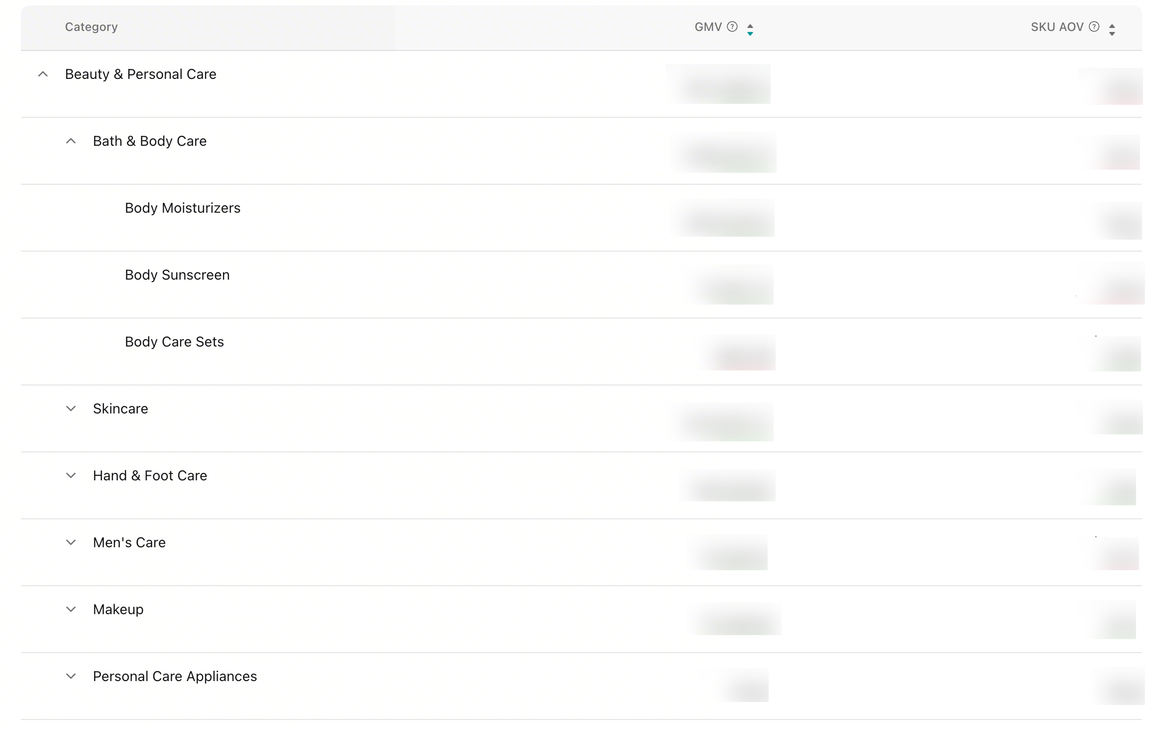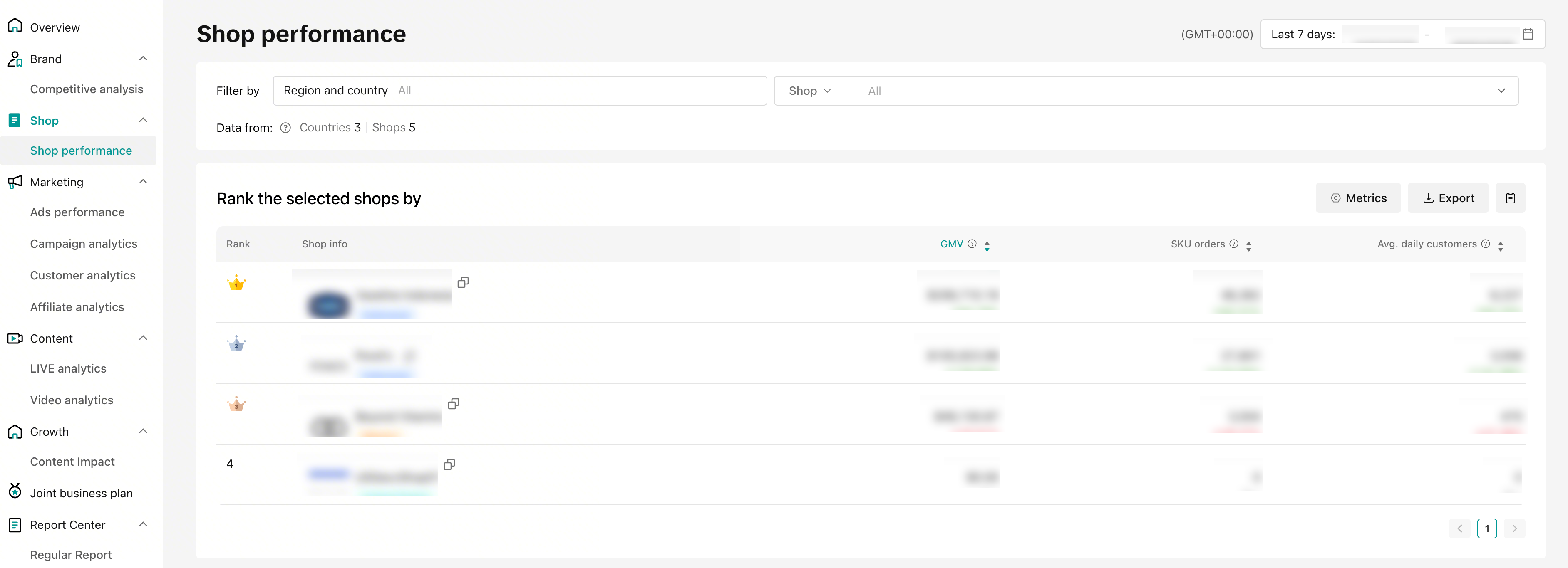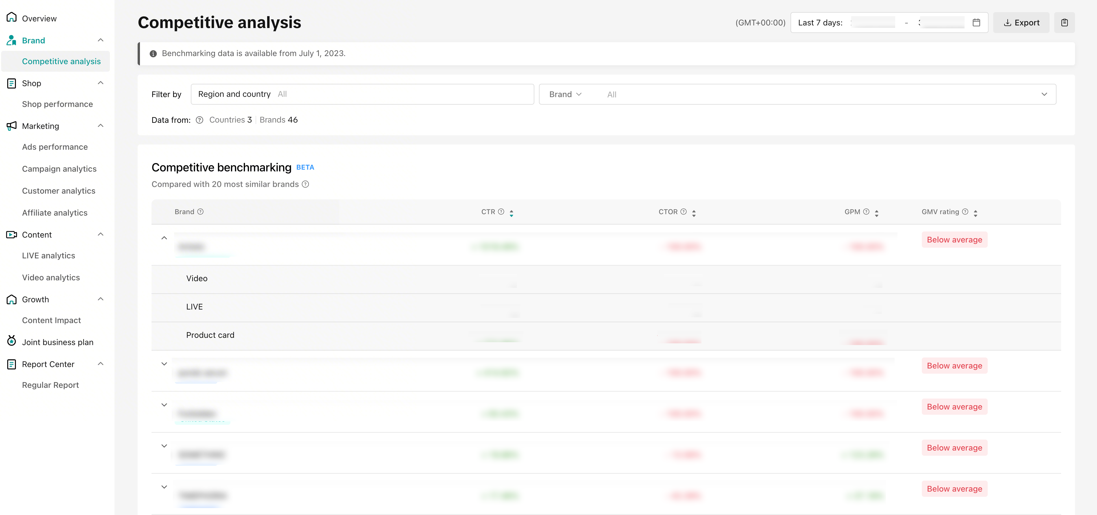 ![]() ![]() | – 在品牌层面提供四大维度与四项核心指标的对比,帮助品牌了解相较于同一市场内的20家相似品牌的表现。在以下四个维度对核心效率指标进行比较: – Video – LIVE – Product Card – Overall – 在每个维度上,Brand Portal 会计算所有相似品牌的 GMV 加权平均值,并展示该品牌与这些相似品牌之间的百分比差异。 – GMV Rating:与 20 家相似品牌进行对比,以显示该品牌的 GMV 高于平均(Above Average)、低于平均(Below Average)或与平均持平(Average)的评级结果。 – GMV per Impression (GPM):每千次观看所带来的 GMV。 – Click-To-Order Rate (CTOR (SKU order)):在所选时间段内,用户点击商品后最终下单的比例。 – Click-Through-Rate (CTR):在所选时间段内,商品被点击的总次数与曝光总次数之比。 |