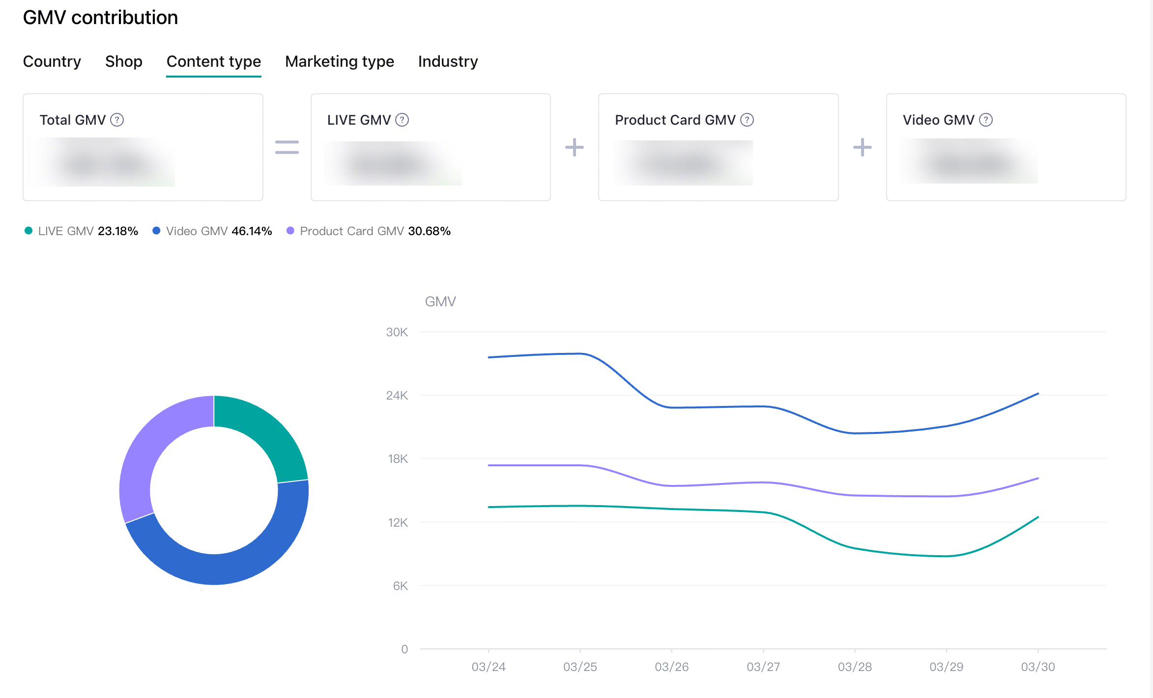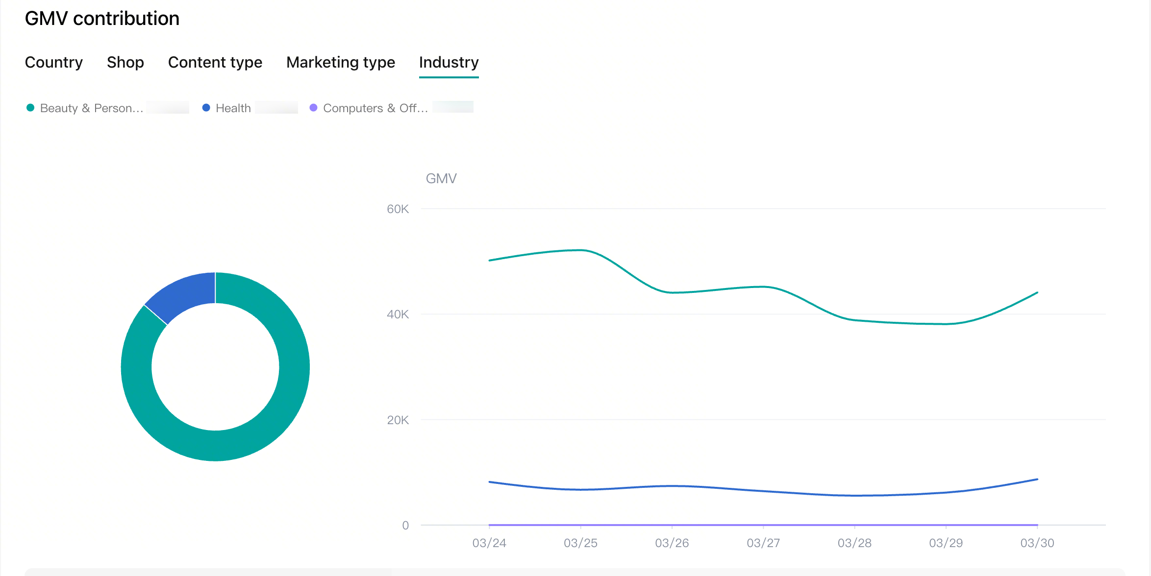 ![]() ![]() ![]() ![]() | – 按国家、店铺、内容类型、营销类型、行业类目\* 等不同维度查看GMV贡献 *行业类目:将GMV分为不同电商商品类目,图表中的分类与明细表中一致 |