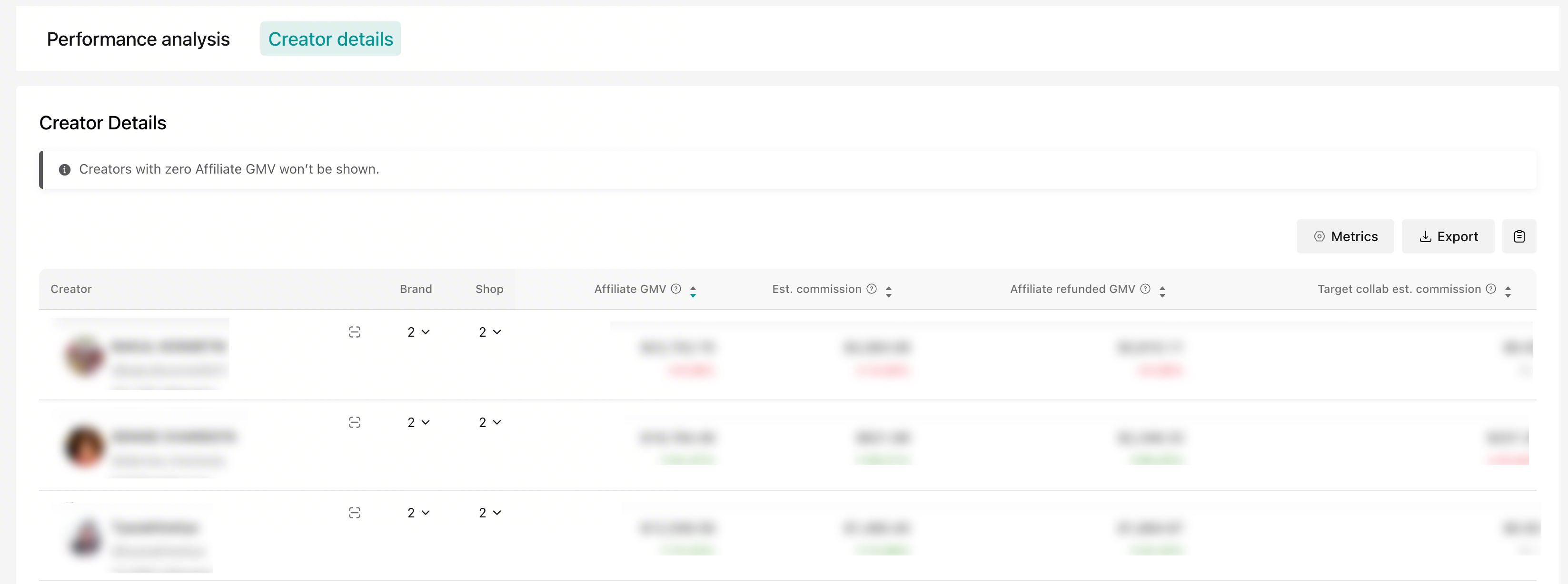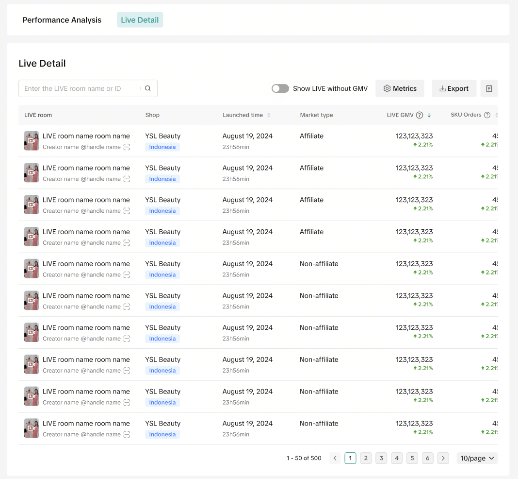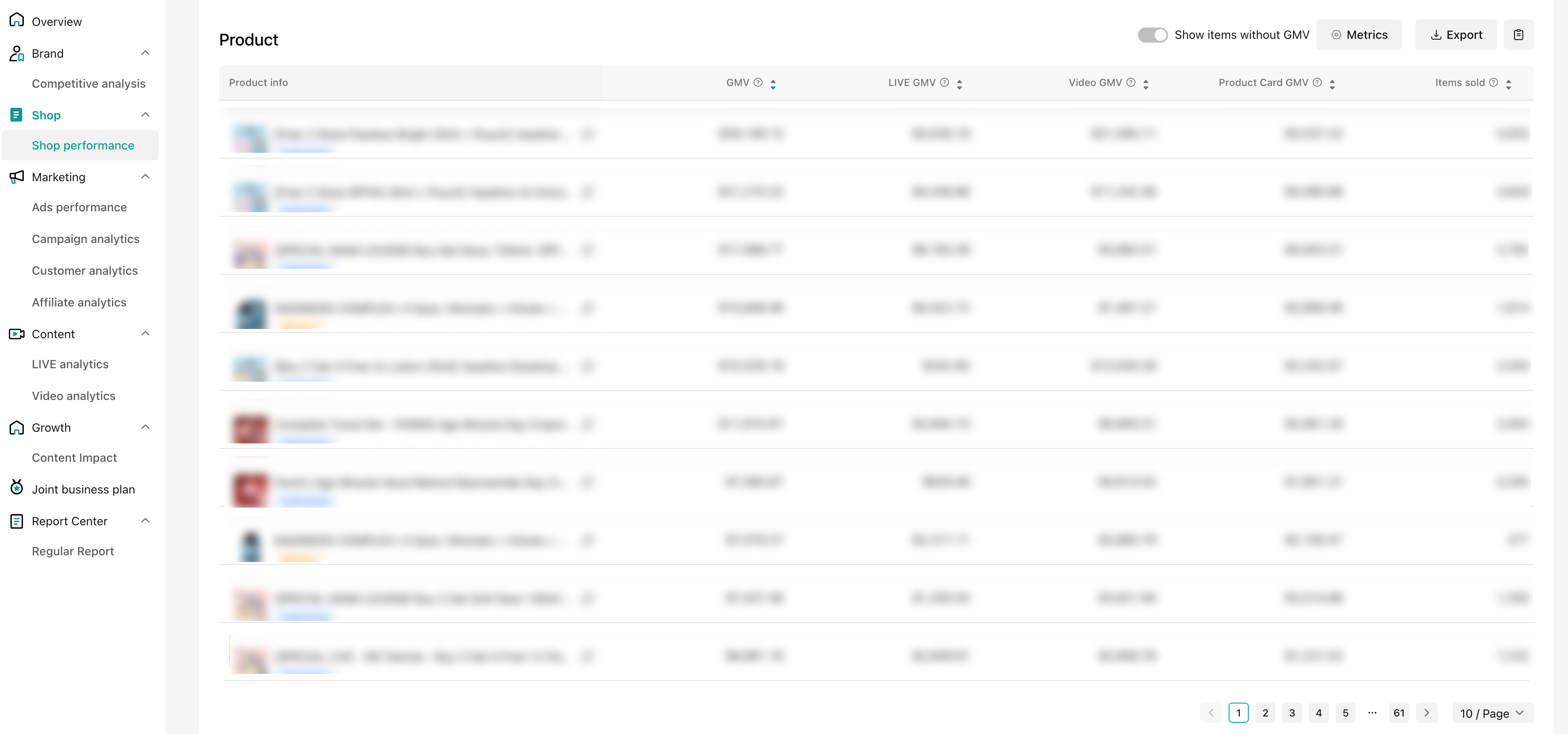 ![]() ![]() | – 您可查看以数据表格的形式列出特定时间范围内的所有直播/视频,并附带详细的表现指标。 – 用户可通过点击“Metrics”按钮来选择或取消选择某些指标。 – 用户还可将当前视图的数据导出为表格。 – 默认情况下,仅展示在所选时段内产生 GMV 的内容。若需要查看所有内容(即使 GMV 为 0),可开启“Show LIVE/Video without GMV”选项。 |