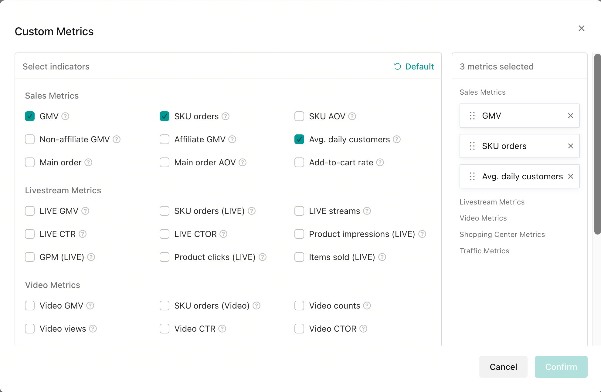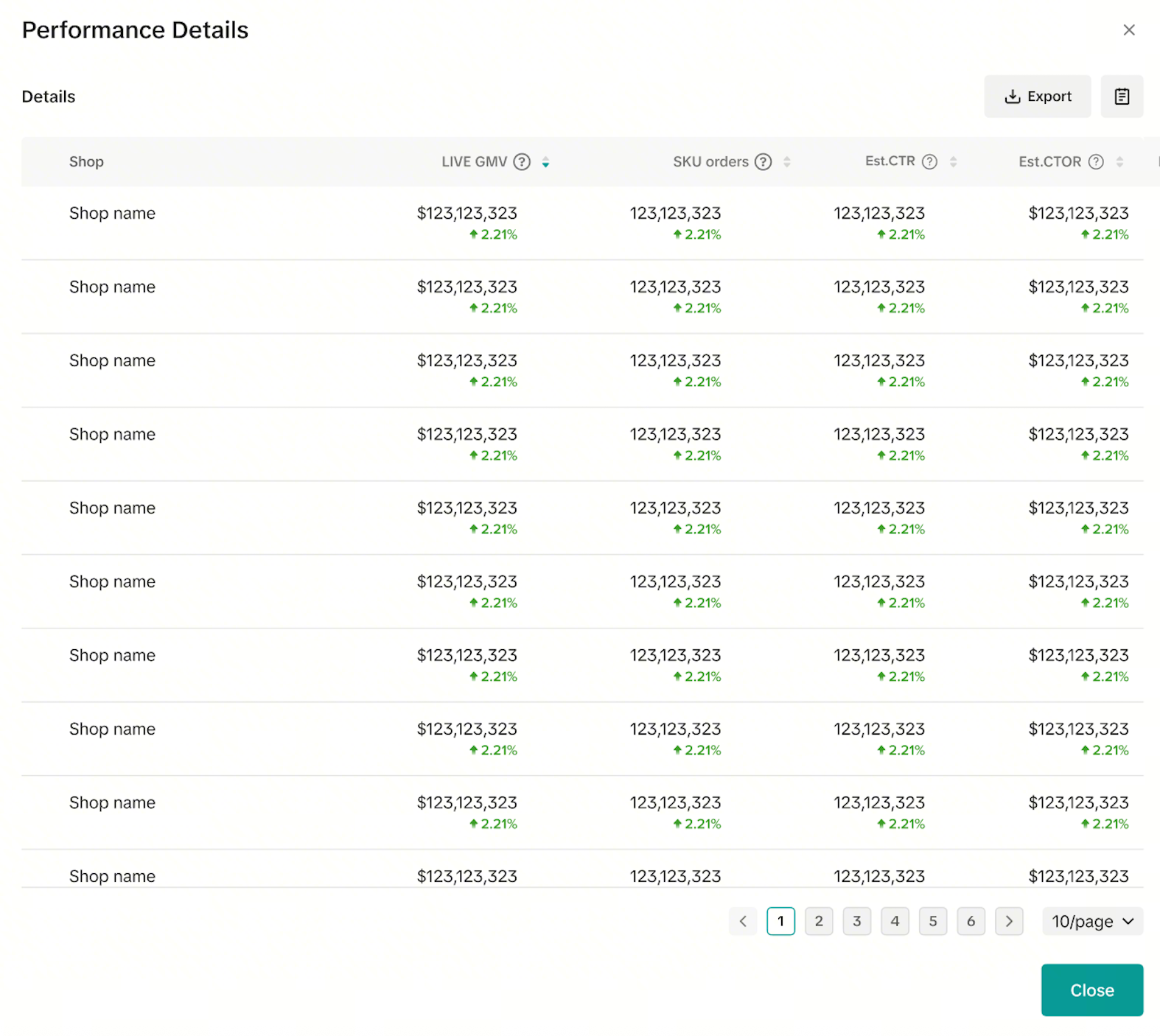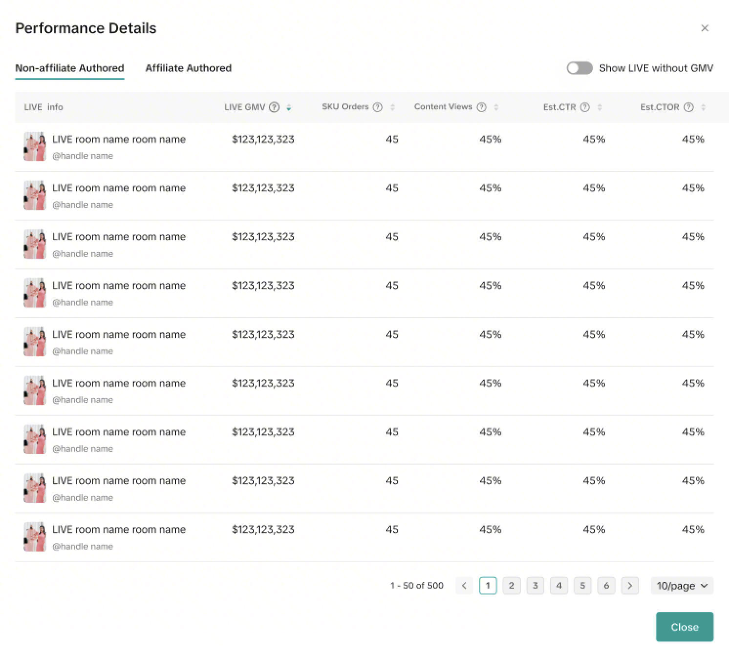 ![]() ![]() | – 您可查看以数据表格的形式列出特定时间范围内的所有直播/视频,并附带详细的表现指标。 – 用户可通过点击“Metrics”按钮来选择或取消选择某些指标。 – 用户还可将当前视图的数据导出为表格。 – 默认情况下,仅展示在所选时段内产生 GMV 的内容。若需要查看所有内容(即使 GMV 为 0),可开启“Show LIVE/Video without GMV”选项。 |