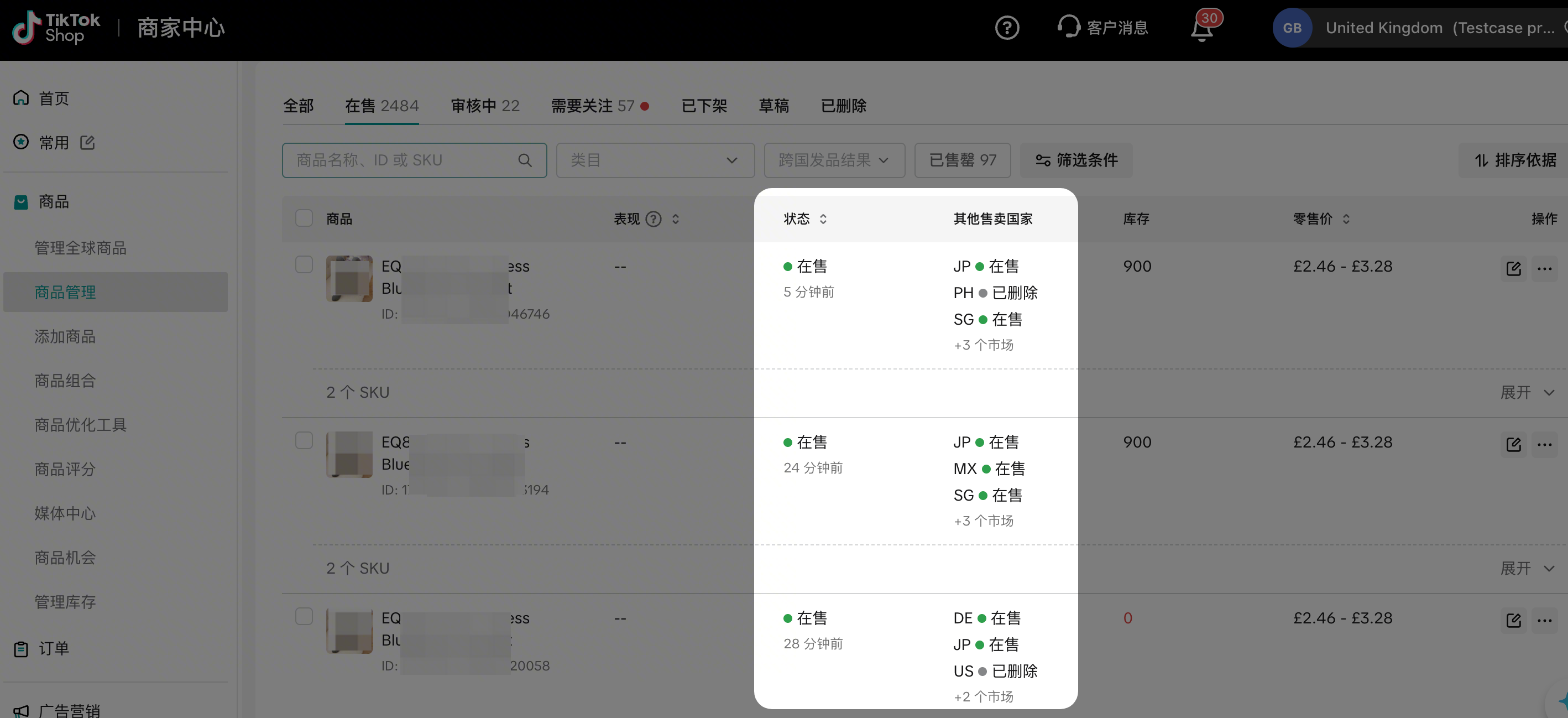 需要在「商品管理」页面,采用「多市场铺品」路径进行发品(创建商品→填写信息→设置多市场库存&售价→补充新市场合规信息→提交多市场审核→审核通过→展示售卖),如果您未使用上述「多市场铺品」路径,而是在多个市场分别发布了同一商品,该商品的销量评价将无法聚合展示。