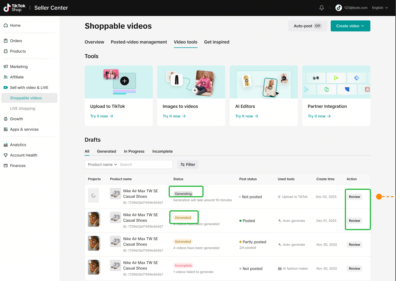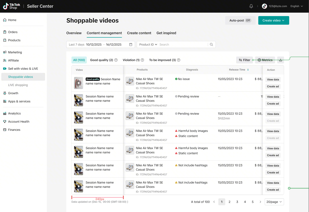 | 1、功能入口 | – 功能入口:SC后台shoppable videos-Content Management; – 选择【Content Management】,来到后台视频管理页面,这里会显示您所有的短视频; – 支持按照发布国家、账号筛选/查看/管理已发布视频; | ![]() ![]() ![]() ![]() |