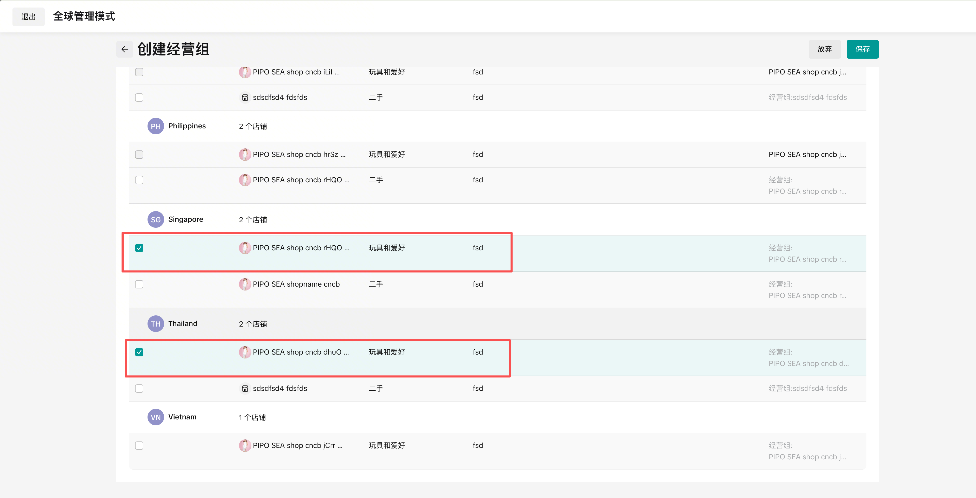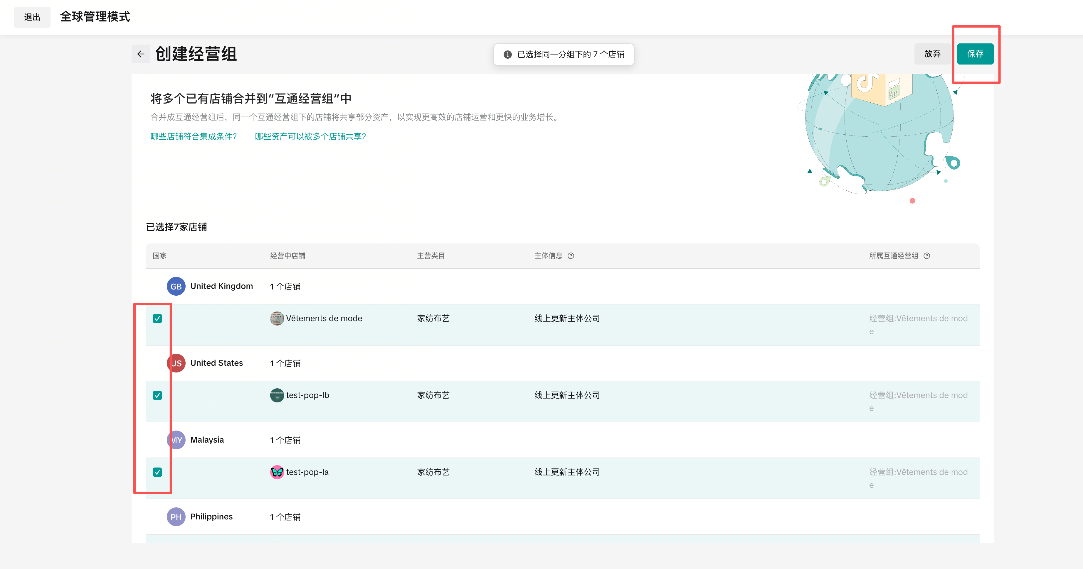 在商家中心完成了「经营组绑定」操作的商家,即可实现一文发全球(操作详见模块一「全球多店管理」)