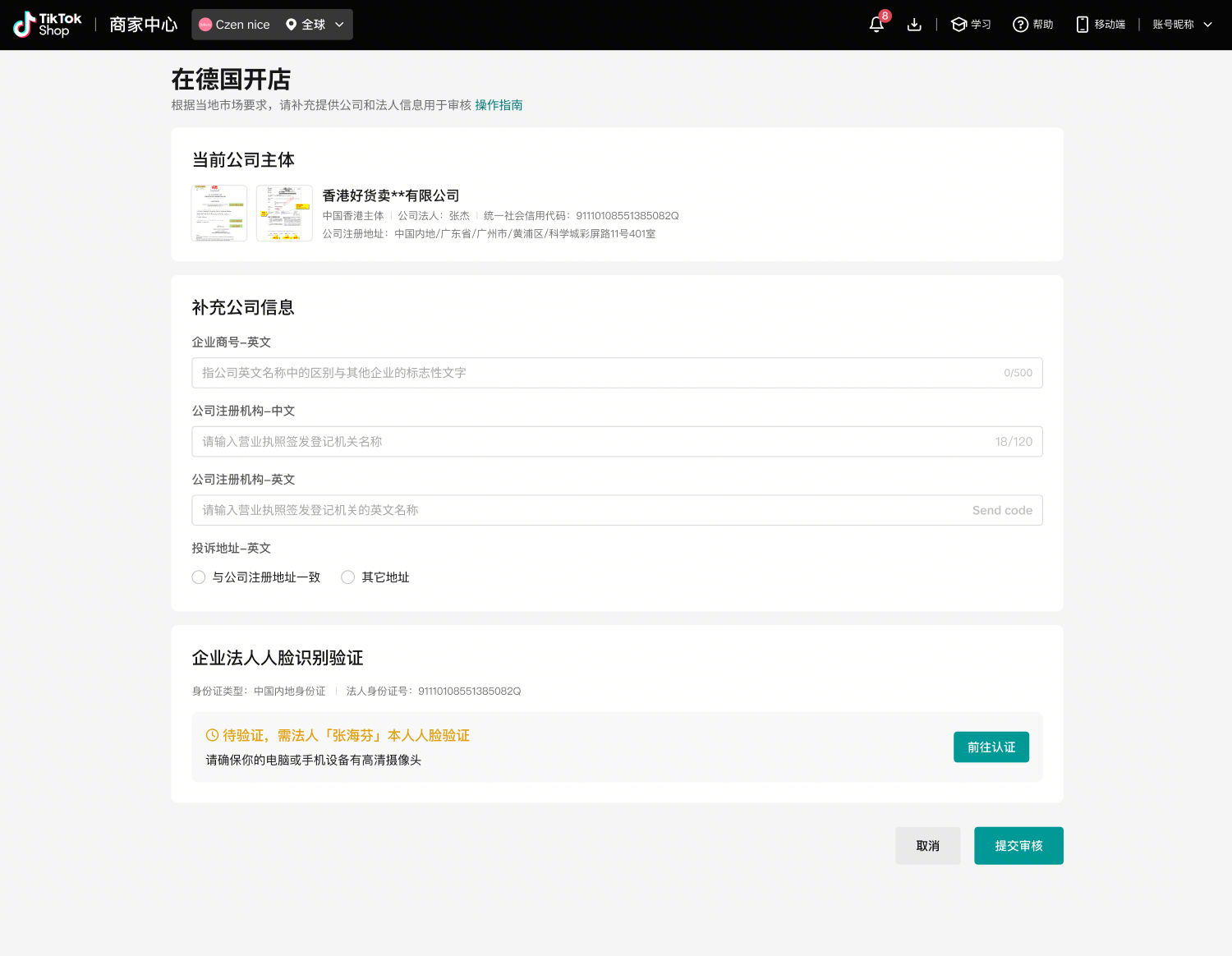 您现有店铺已经提交的资质可在开通新市场时复用,但由于不同市场市场的合规需求不同,您可能需要根据页面提示,补充上传部分资质信息,例如特定的企业注册信息等,并进行人脸识别验证。