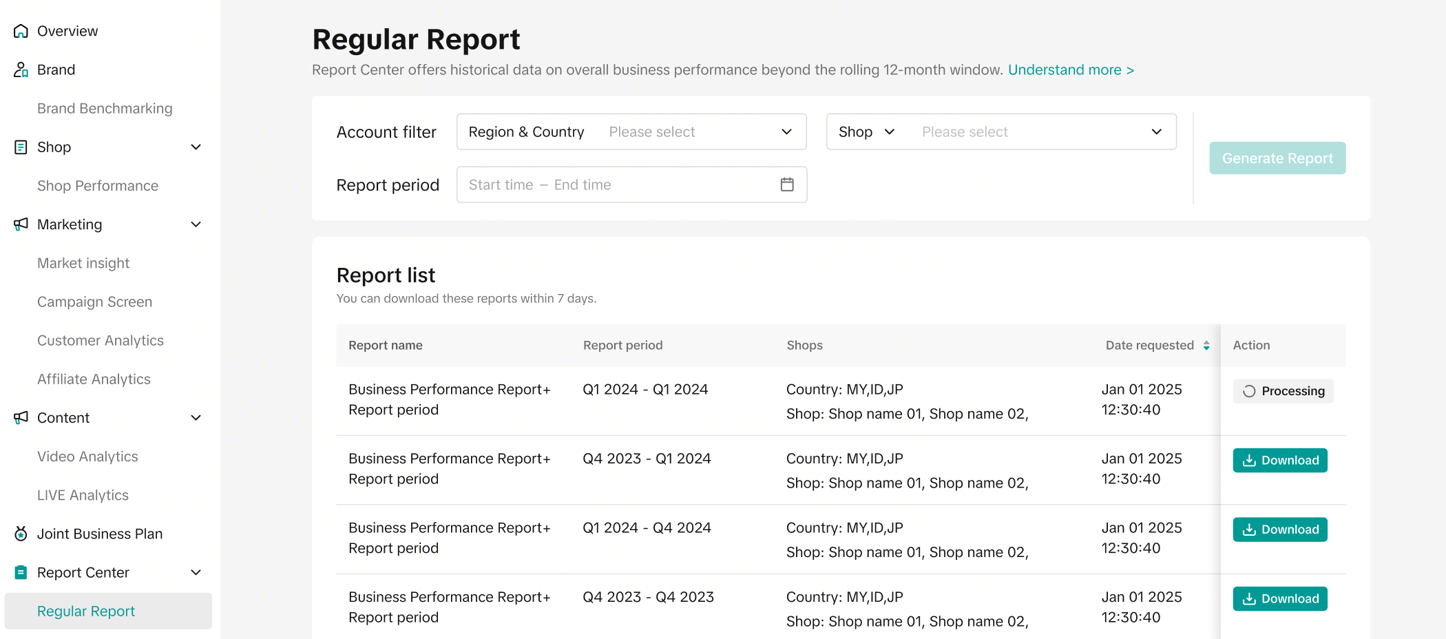 ![]() ![]() | – 历史成交数据报告 报表中心是一款全新工具,品牌方借助该功能,可查看并下载滚动 12 个月周期以外的季度业绩数据,数据最早可追溯至 2023 年第四季度。如今,品牌能够便捷调取历史数据,为后续季度的战略规划提供决策依据。 – 每逢新季度开启,即可查阅上一年度季度数据;2023 年第四季度与 2024 年第一季度数据已预先开放权限。 – 历史业绩报表将持续累积,形成长效数据资料库。 – 可单选或多选店铺,满足个性化报表生成需求。 |