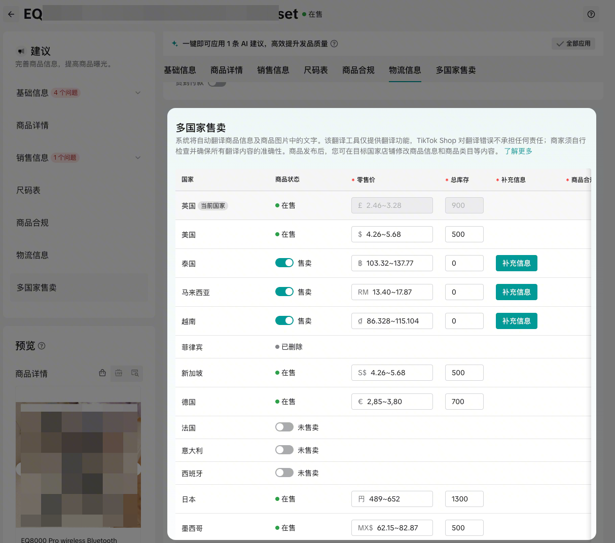 需要在「商品管理」页面,采用「多市场铺品」路径进行发品(创建商品→填写信息→设置多市场库存&售价→补充新市场合规信息→提交多市场审核→审核通过→展示售卖)