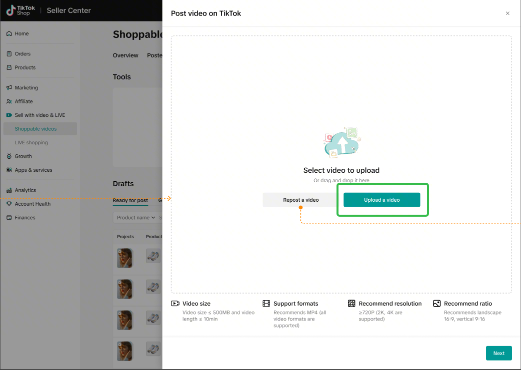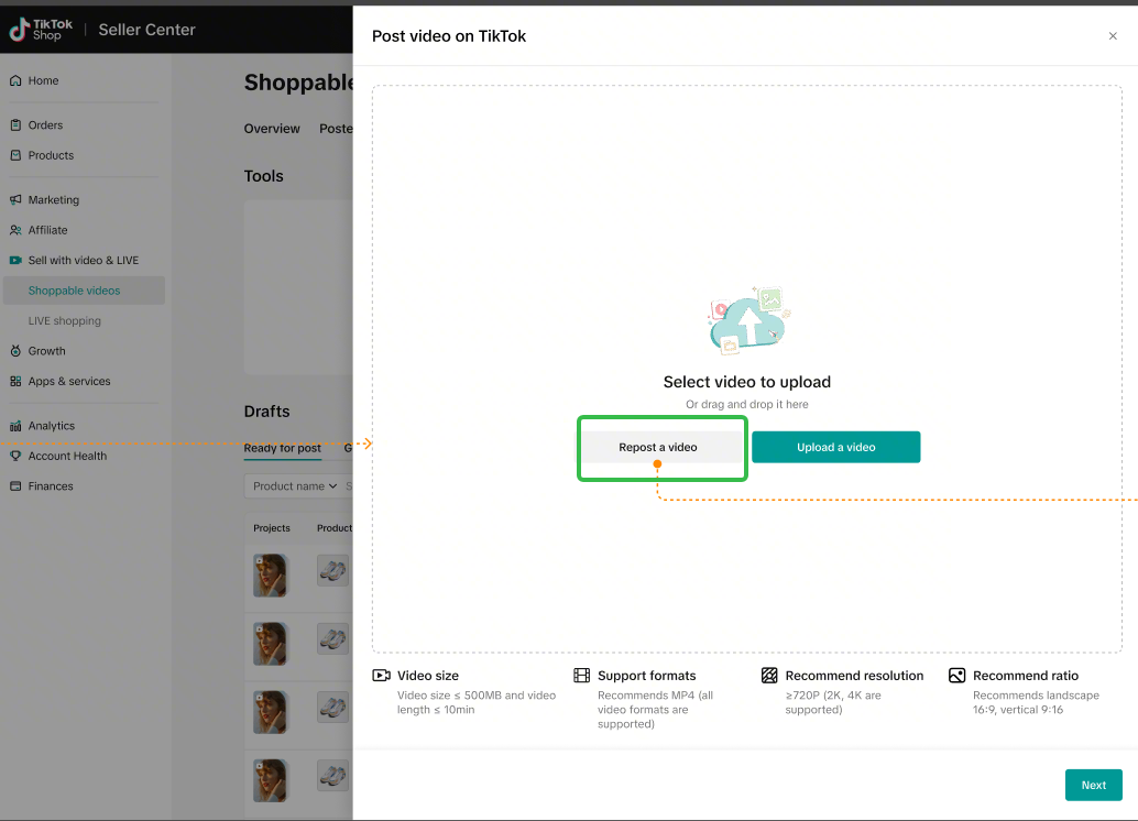 | 2、素材库已有内容,选择后发布 | – 如果您的Content library已有您想要发布的视频素材,可以选择【Repost a video】; | ![]() ![]() |