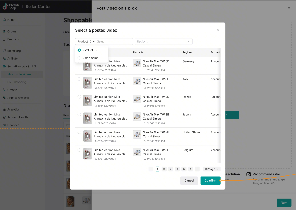 | | – 此时,将为您展示关联账号组视频素材库中所有的视频素材; – 支持按照商品ID、视频名称和店铺国家快速筛选想要发布的视频素材; – 选择需要发布的素材,点击Comfirm; | ![]() ![]() ![]() ![]() |