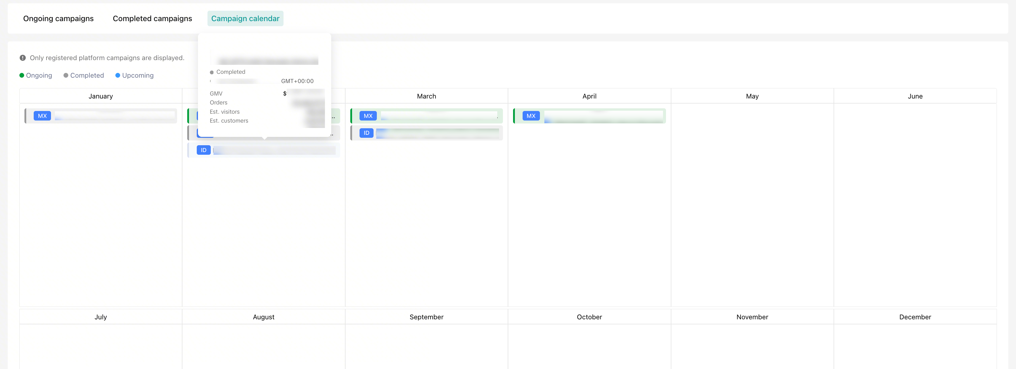![]() ![]() ![]() ![]() | – 大促日历 – 展示您在所有市场地区店铺活动的综合视图,包括已完成、当前和未来活动,支持按地区、市场或店铺筛选。 – 将鼠标悬停在已完成和正在进行的活动上,即可快速查看活动表现。 注意:您无法在Brand Portal中直接报名活动。如需报名,请前往商家工作台。 |