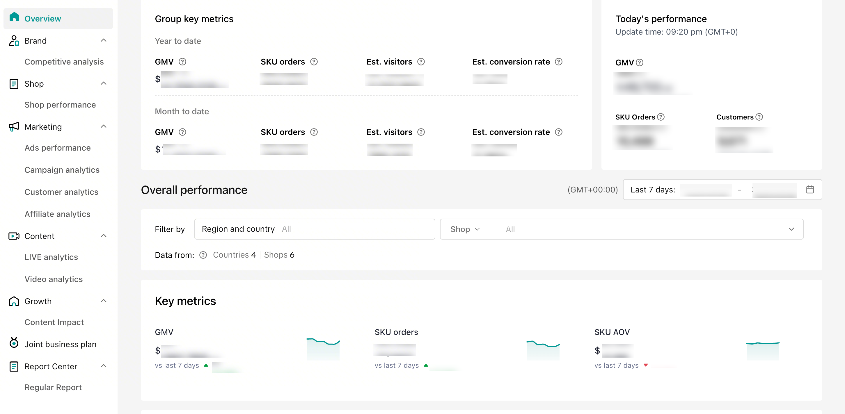 Brand Portal 是专为多店经营商家打造的集团化数据分析中心。它可以将您在全球的所有店铺经营数据进行汇总展示,提供全局视角的业务洞察,帮助您的管理团队高效监控经营状态,提升战略决策能力。