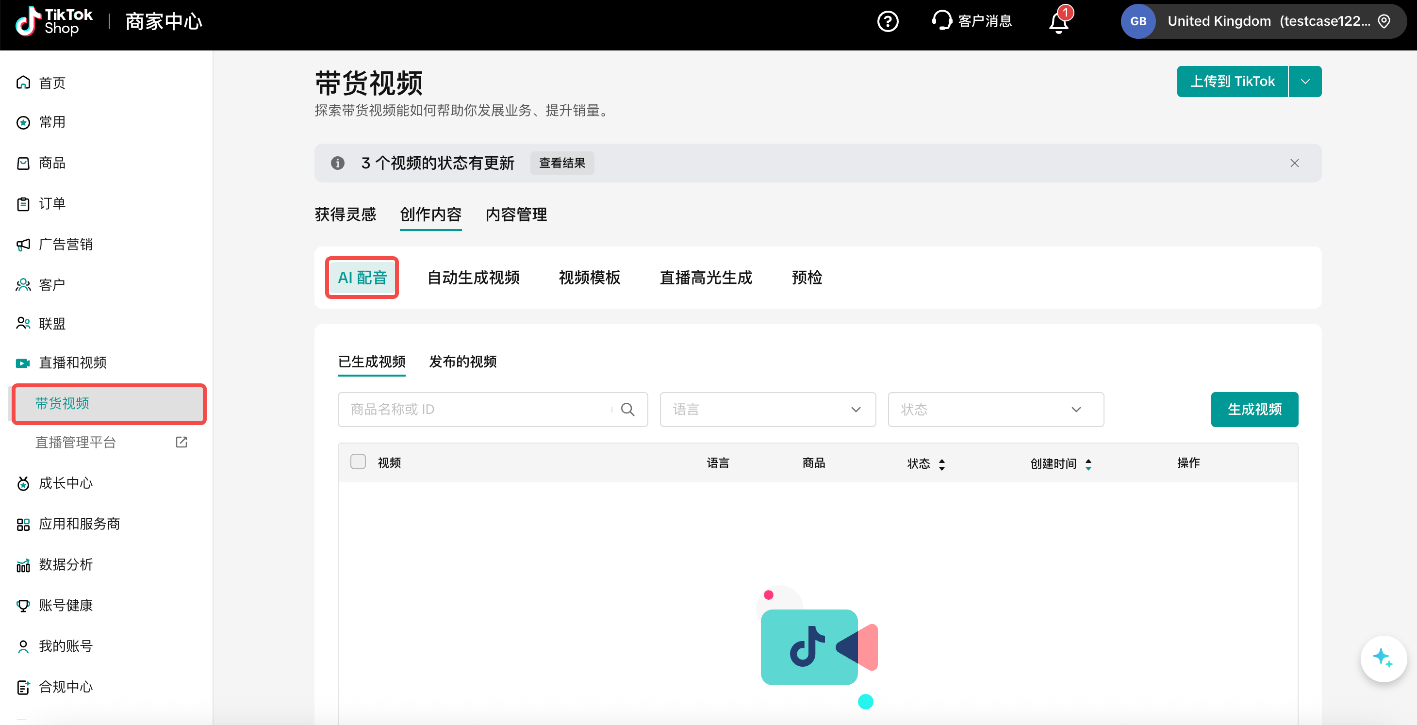 - 在 AI 配音板块下,卖家会看到【生成视频】按钮