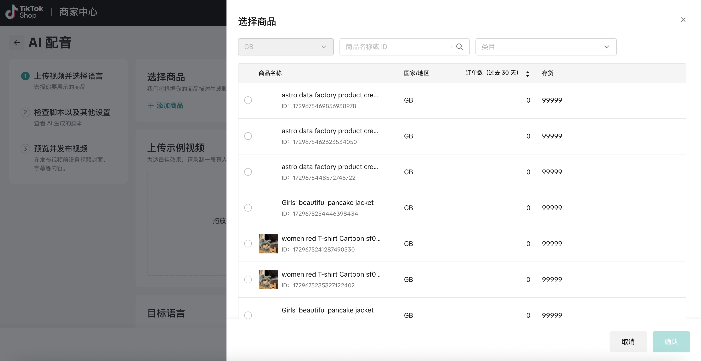 - 此时卖家需选择店铺中在售的有效商品,用于创建视频