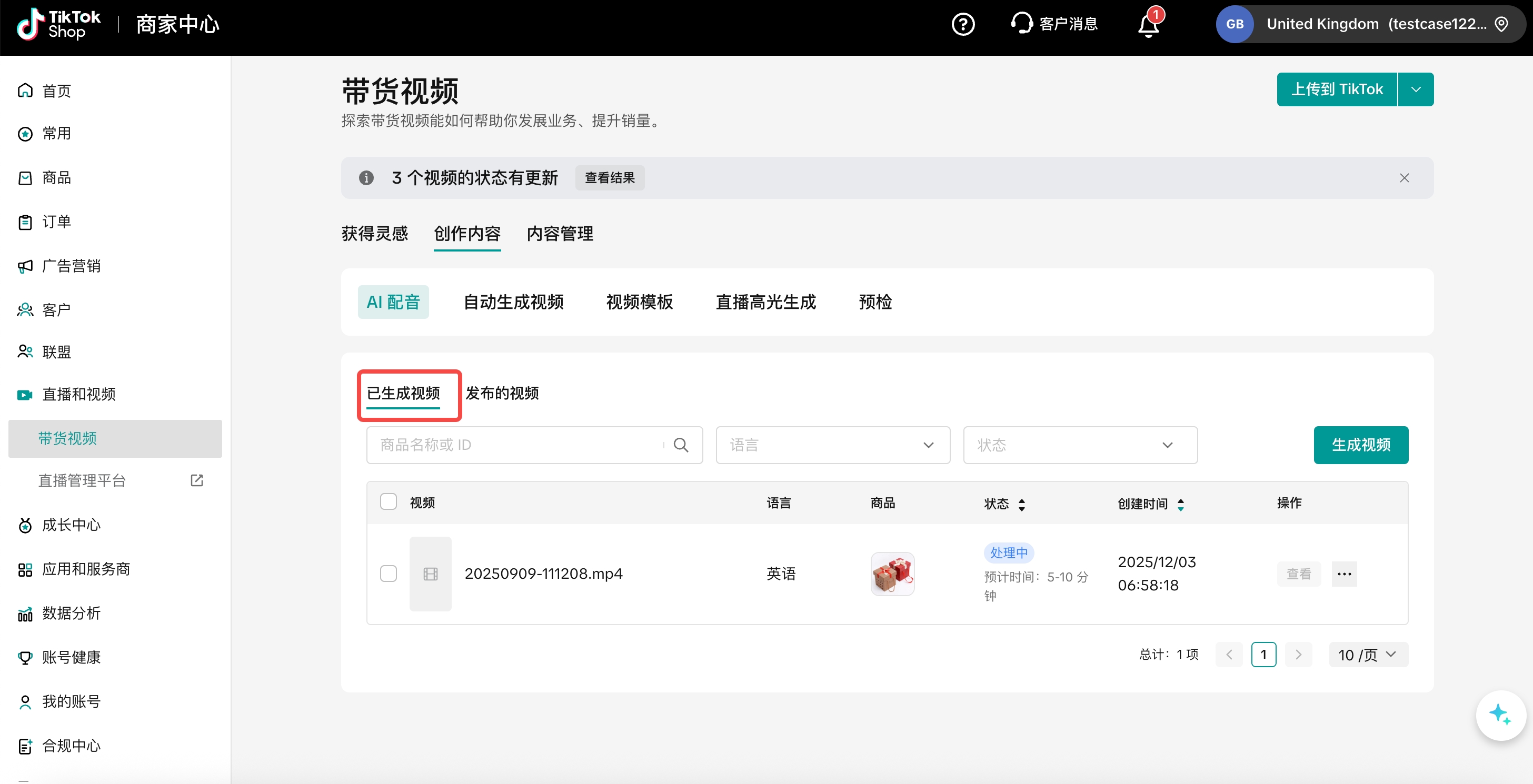 卖家中心 > 直播与视频 > 带货视频