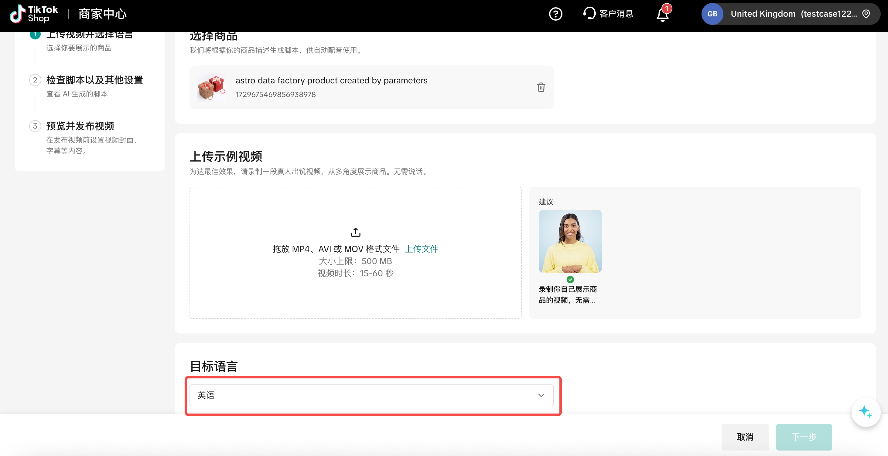 - 接下来,卖家需上传一段展示视频:由出镜人员从不同角度展示产品。视频中人员无需开口说话,因为 AI 会在下一步生成音频脚本。同时,卖家可在此处选择脚本需要翻译成的目标语言。