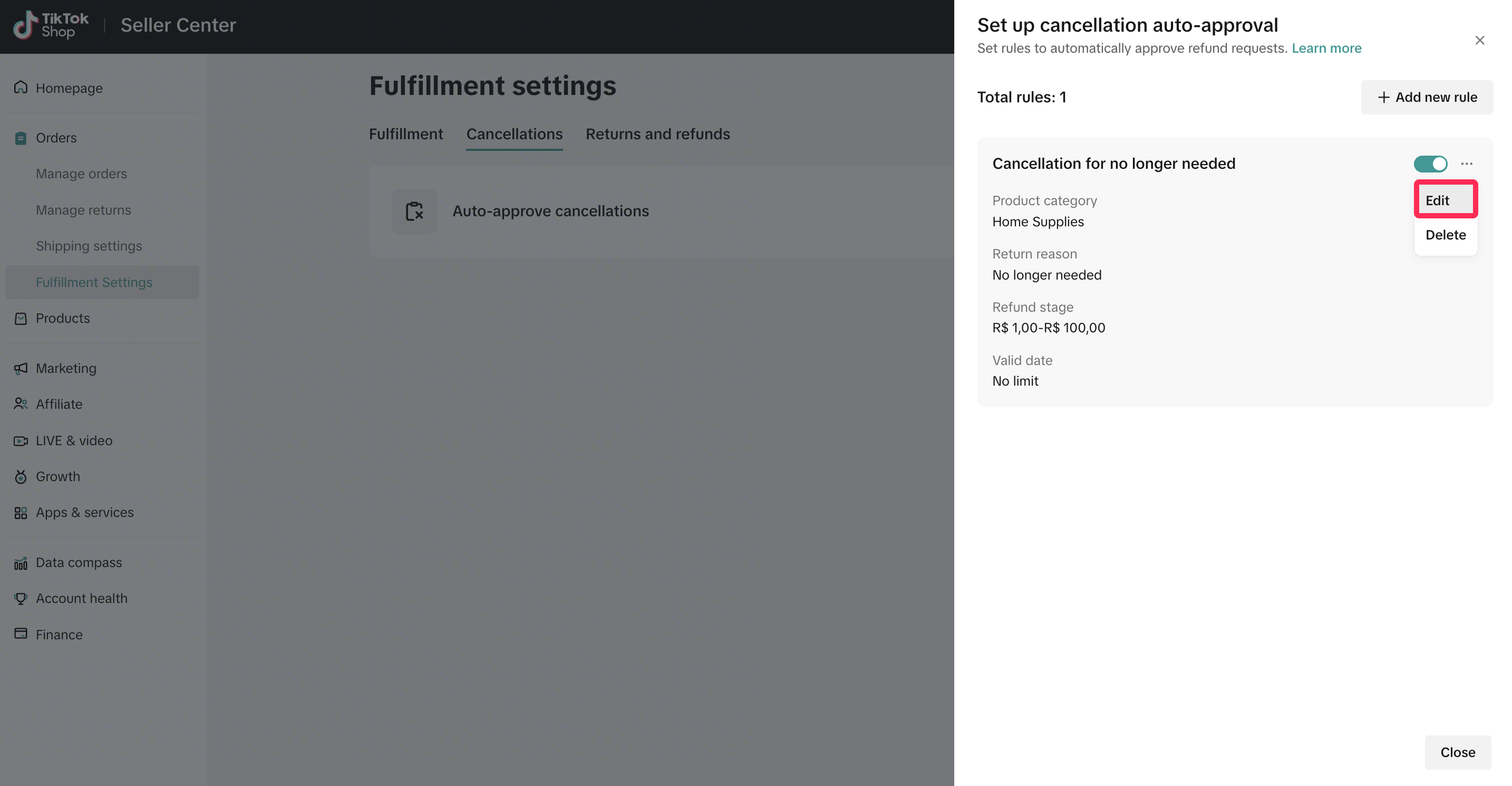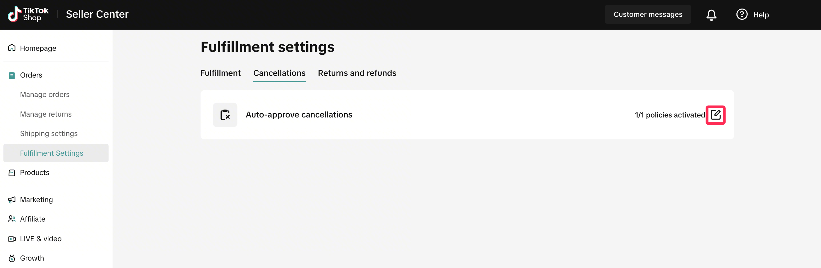 - To edit existing rules, navigate to the Fulfiment Settings page. Under the Cancellations tab, click on the edit icon.