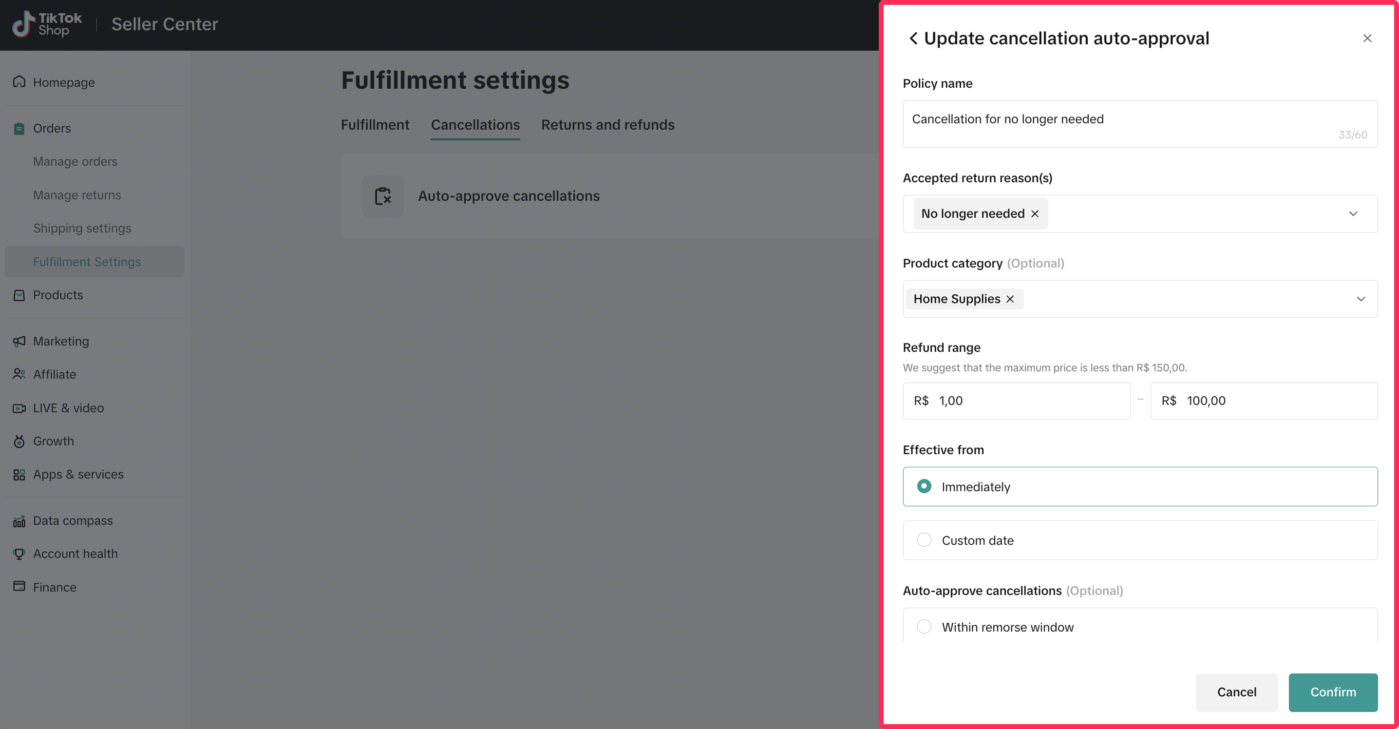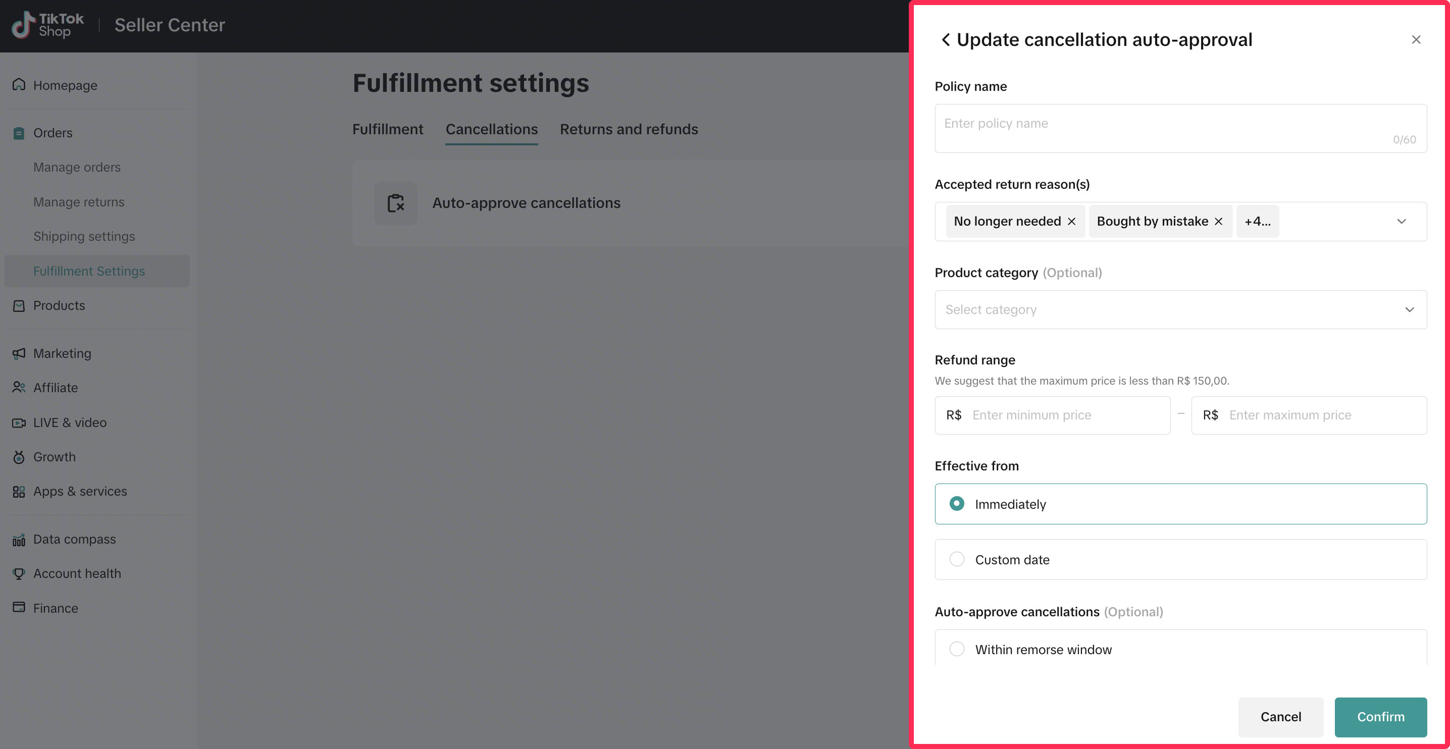 - On this page, you can set the policy name and select the accepted reasons, product categories, price range, effective date, and conditions. The cancellation request will be automatically accepted when the buyer’s reason aligns with your settings. Please review your selections carefully before clicking ‘Confirm’ to enable the cancellation rule.