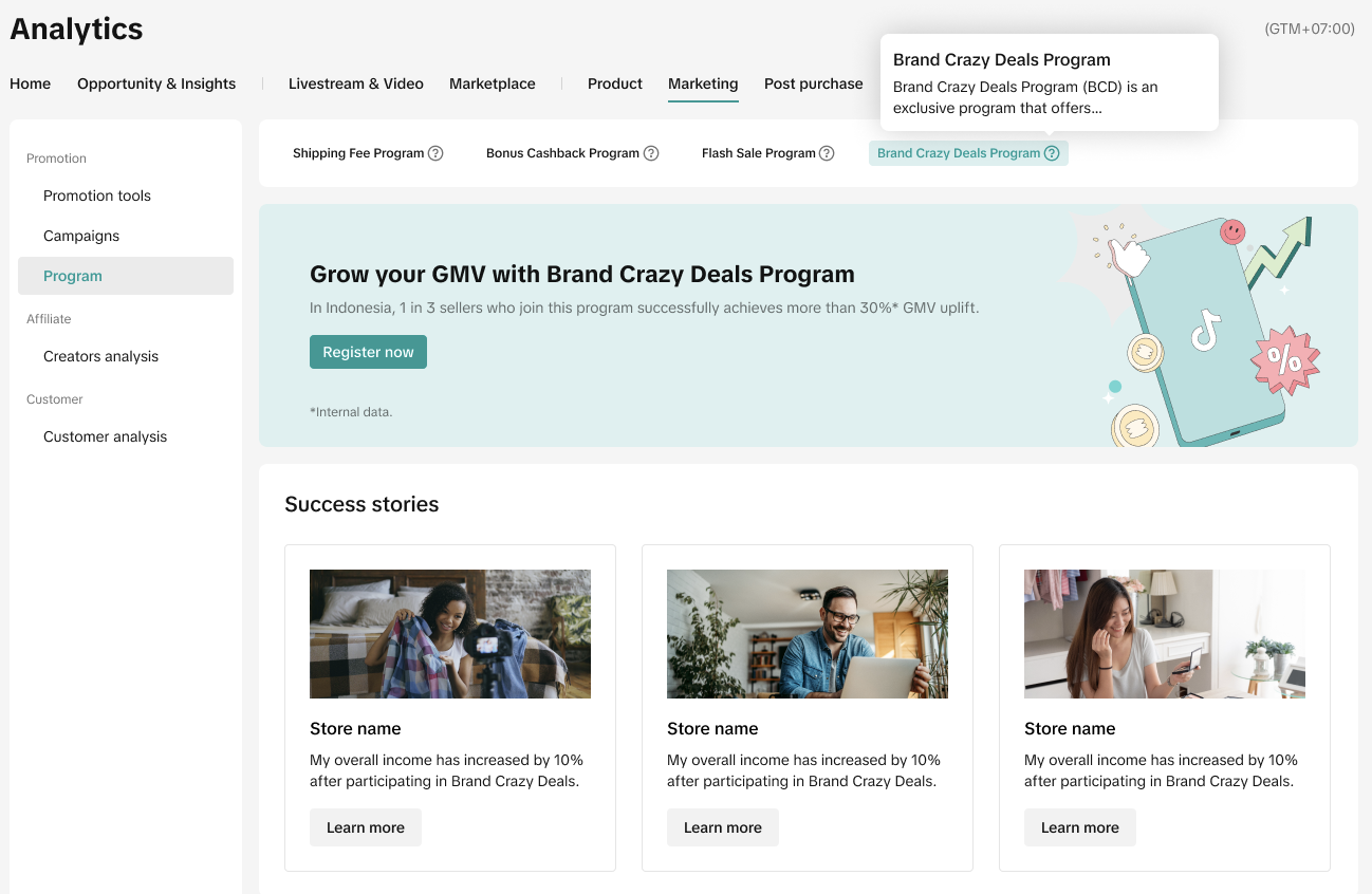 Brands Crazy Deals 是一项策略性举措,旨在为参与计划的商家带来优质福利,包括提供专属优惠券、提高曝光度以及为合格订单发放补贴。参与该计划需要满足特定资格标准。请联系您的客户经理了解更多信息。