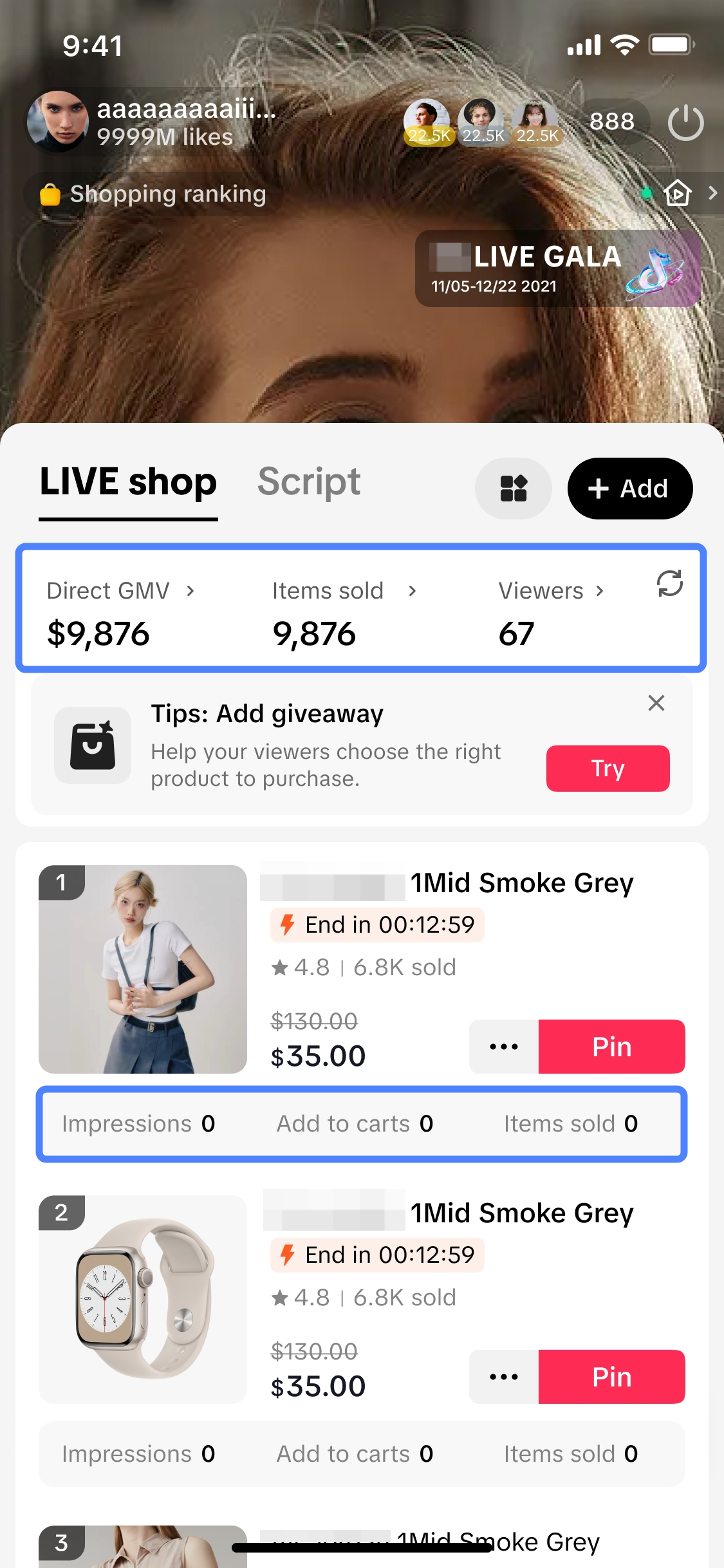 ![]() ![]() | 直播数据概览* 在此可以快速实时了解直播总体表现!监控直播时的直接GMV、已售商品和观众人数波动情况,了解能引起观众共鸣的内容,在需要时采取行动快速优化直播。 – 直接GMV:直接来源于直播的已付订单总额,含退货和退款。 – 已售商品:直接来源于直播的已售商品数量。 – 观众人数:直播间的观众人数。 需要时可以点击“刷新”图标,或点击各指标旁边的“>”图标打开完整的“直播分析”页面! *购物车中至少存在1个商品时会出现此模块。 |