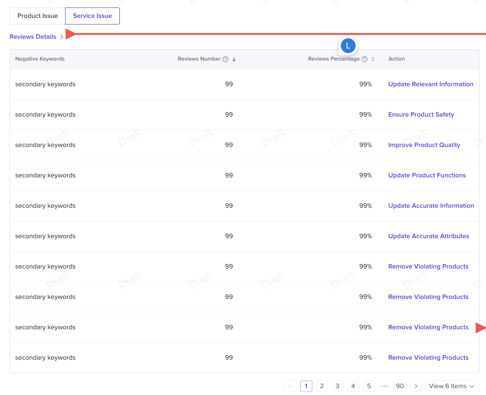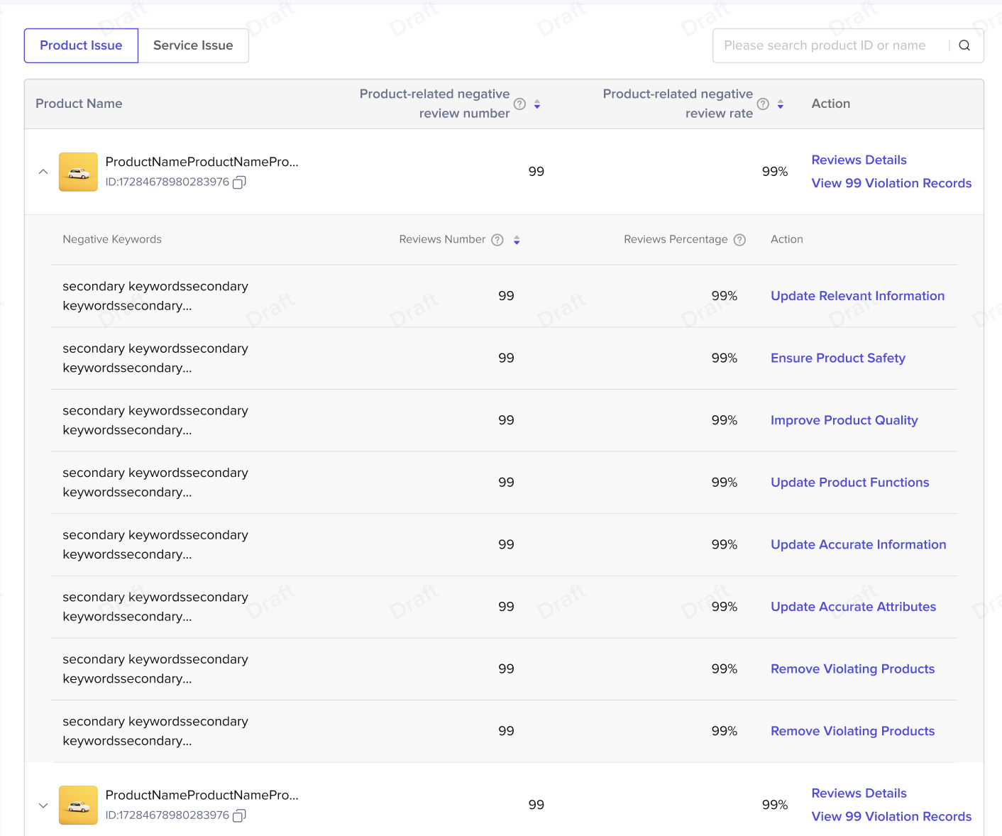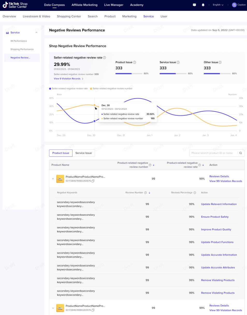 商家可以在【product issue】中查看具体是哪些商品带来了高差评,并支持查看消费者给这个商品的高差评的关键原因。支持商家根据差评原因,去优化商品质量、信息准确性等。