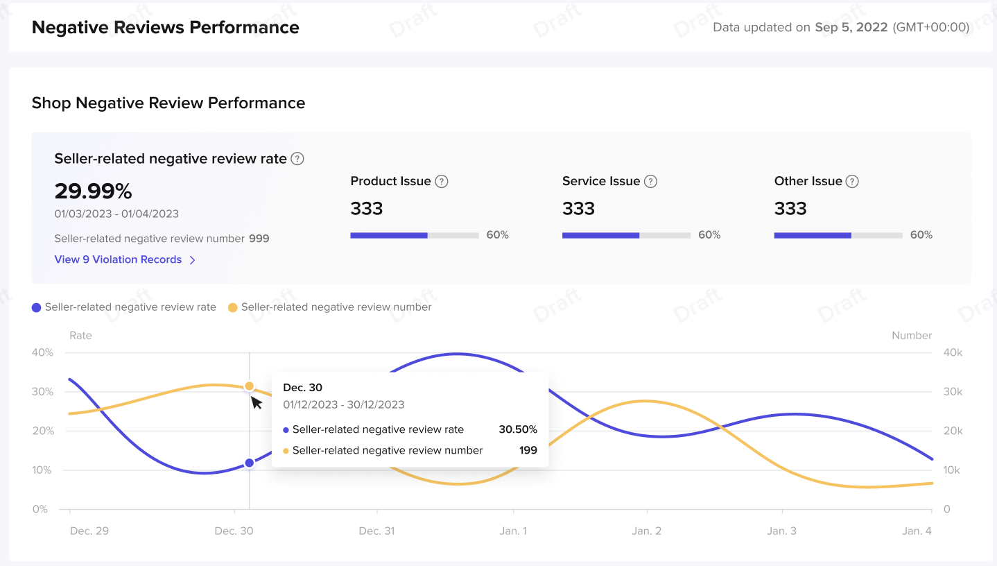 核心指标:商责差评率(Seller related negative review rate) 包含近30天内由于店铺原因导致的差评比例,包含商品相关差评、服务相关差评和其他差评。