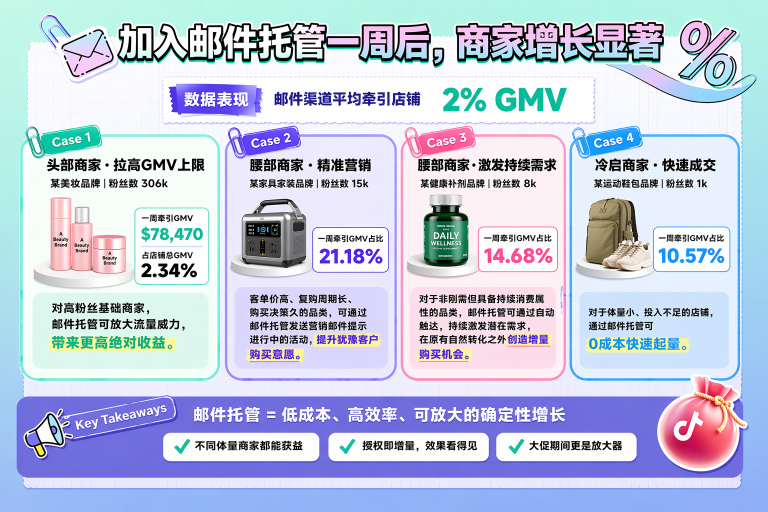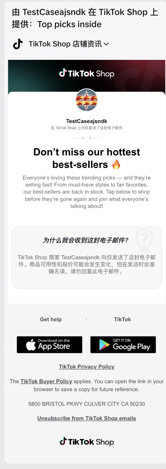 让TikTok Shop代表您的品牌,自动发送营销邮件!授权后,邮件将使用您的店铺域名(shopname@tiktokshop.com),在8种场景下直接向您的粉丝和过往买家发送定向邮件,帮您提升品牌知名度,最终推动销售增长。