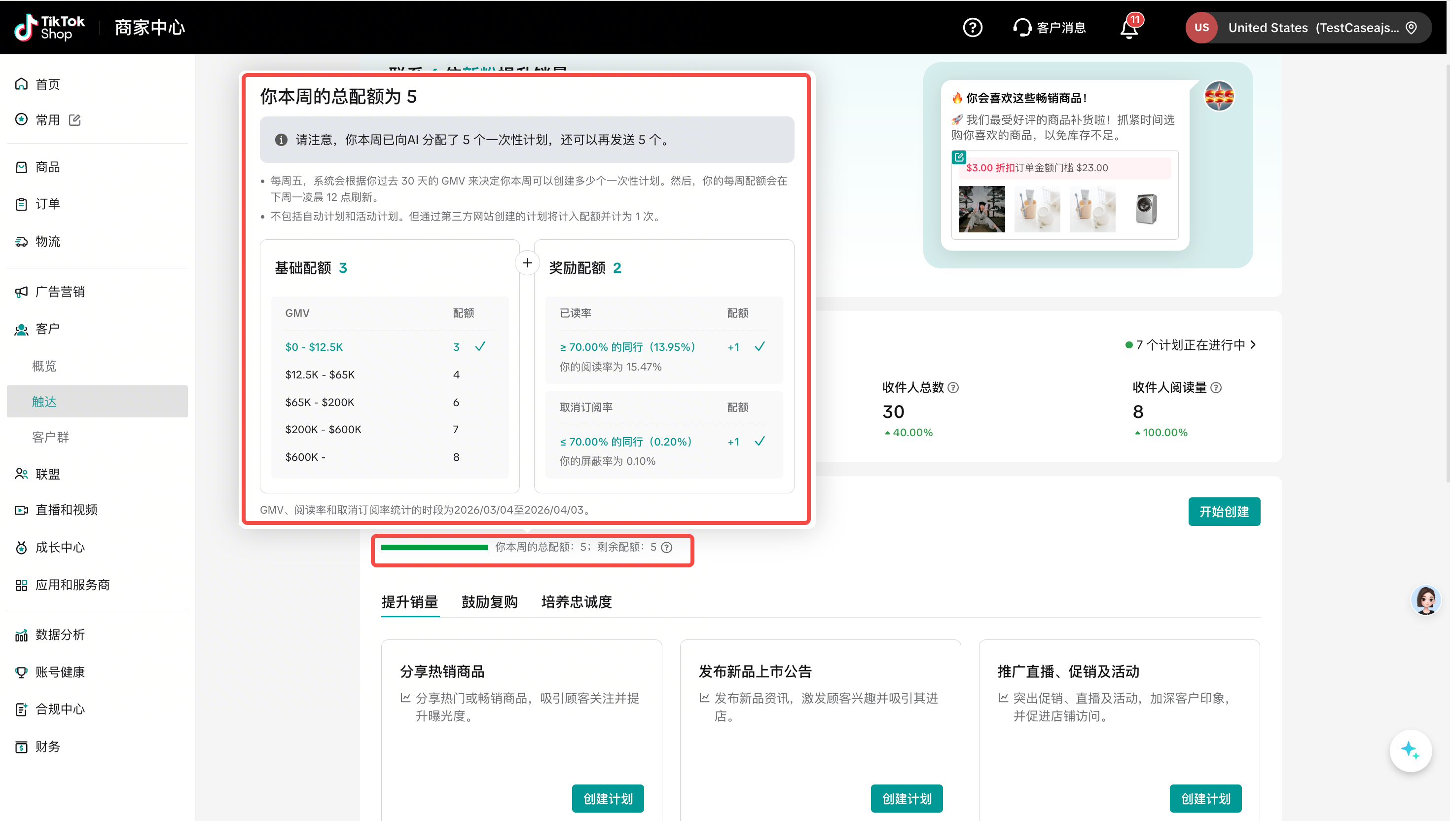您每周可创建的一次性计划数量由每周一过去30天的GMV、阅读率和退订率决定。每周配额在每周一凌晨12点( UTC-4)刷新。