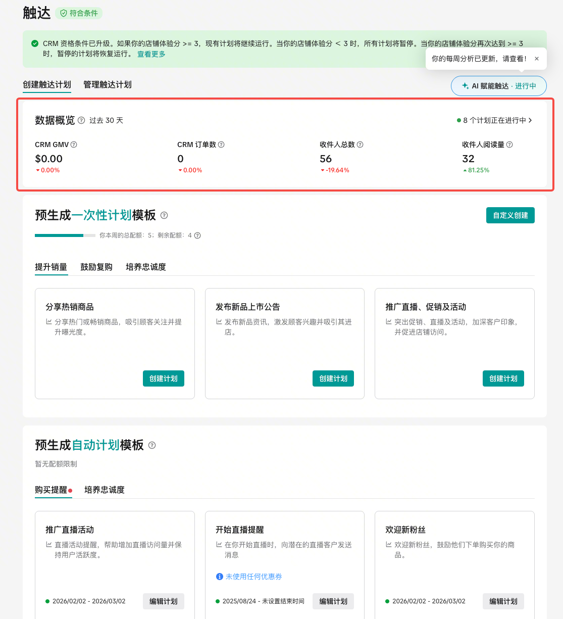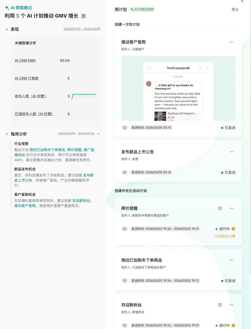 AI托管后,每周会围绕3个维度给出洞察+对应推荐计划:行业最佳实践、新品发布机会、客户复购挖掘,并在下方对应展示推荐的CRM计划,同时支持查看AI托管后CRM计划效果(包含CRM GMV、CRM 订单数 、 收件人数、 已读收件人数)。