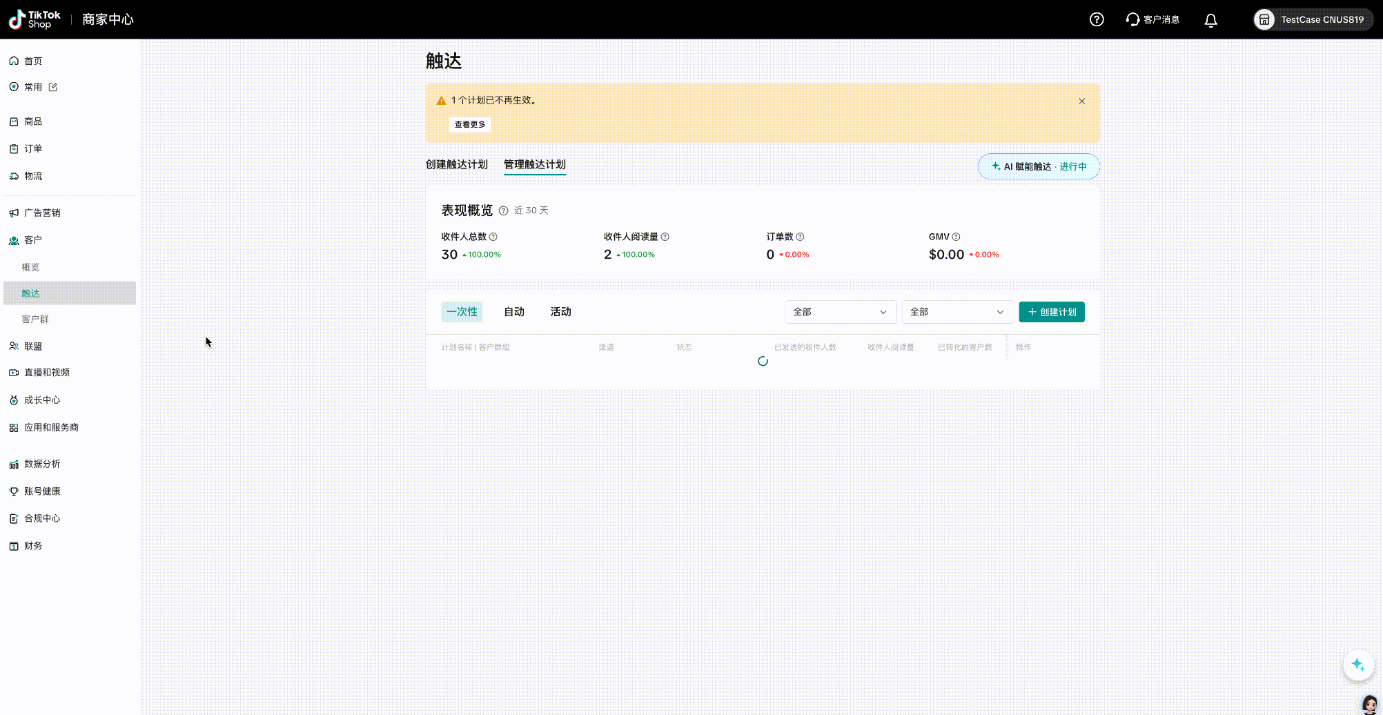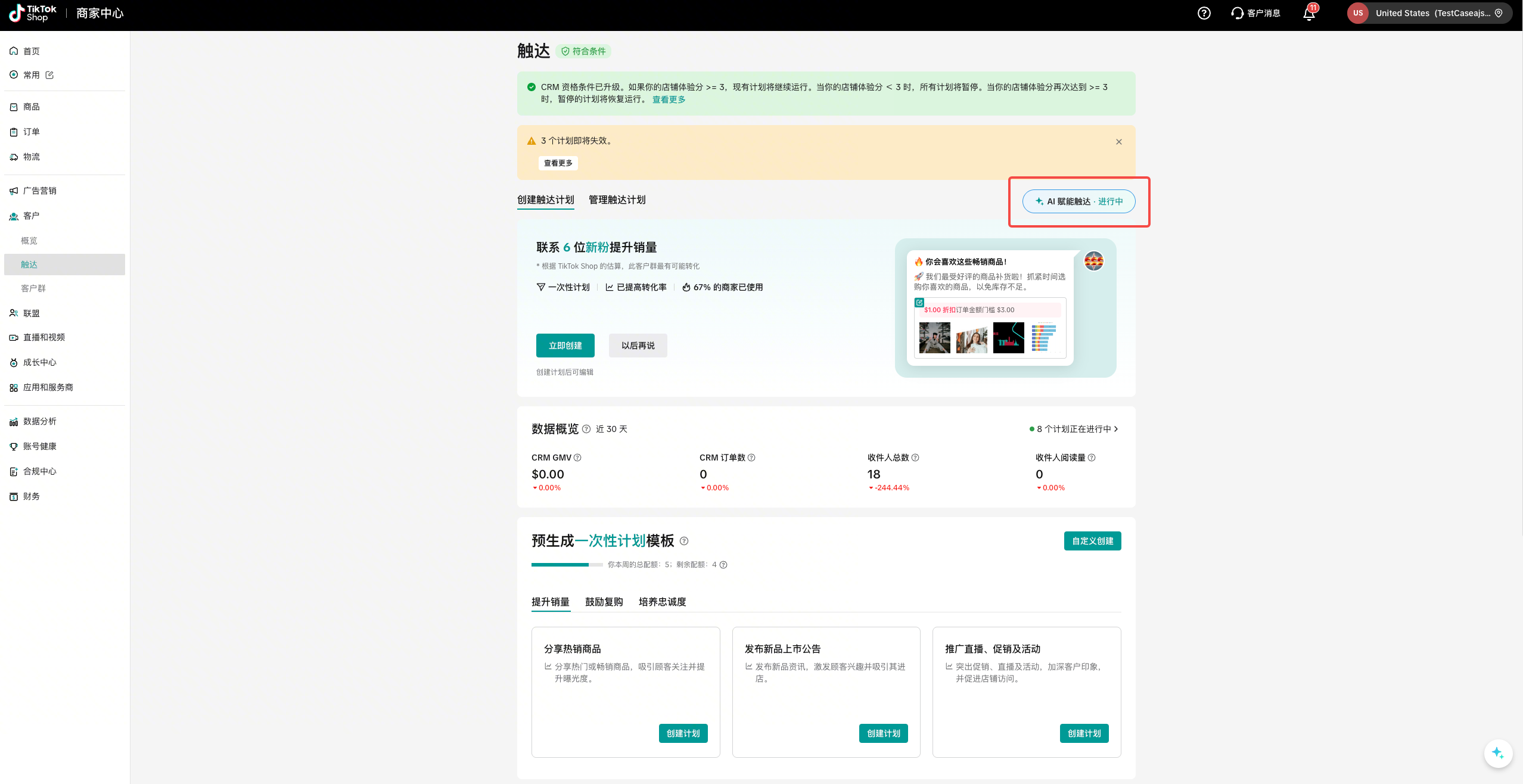 点击 客户 – 触达 – 创建触达计划 ,通过数据概览界面了解触达计划带来的CRM GMV,CRM订单数,收件人总数与收件人阅读量。