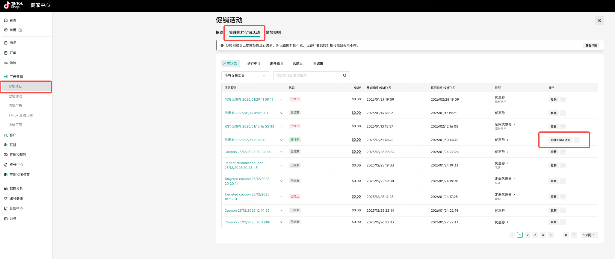 - 通过 促销活动 -> 管理你的促销活动 创建CRM计划(仅支持处于“进行中”状态下的普通券、定向人群券、新人券、关注券)