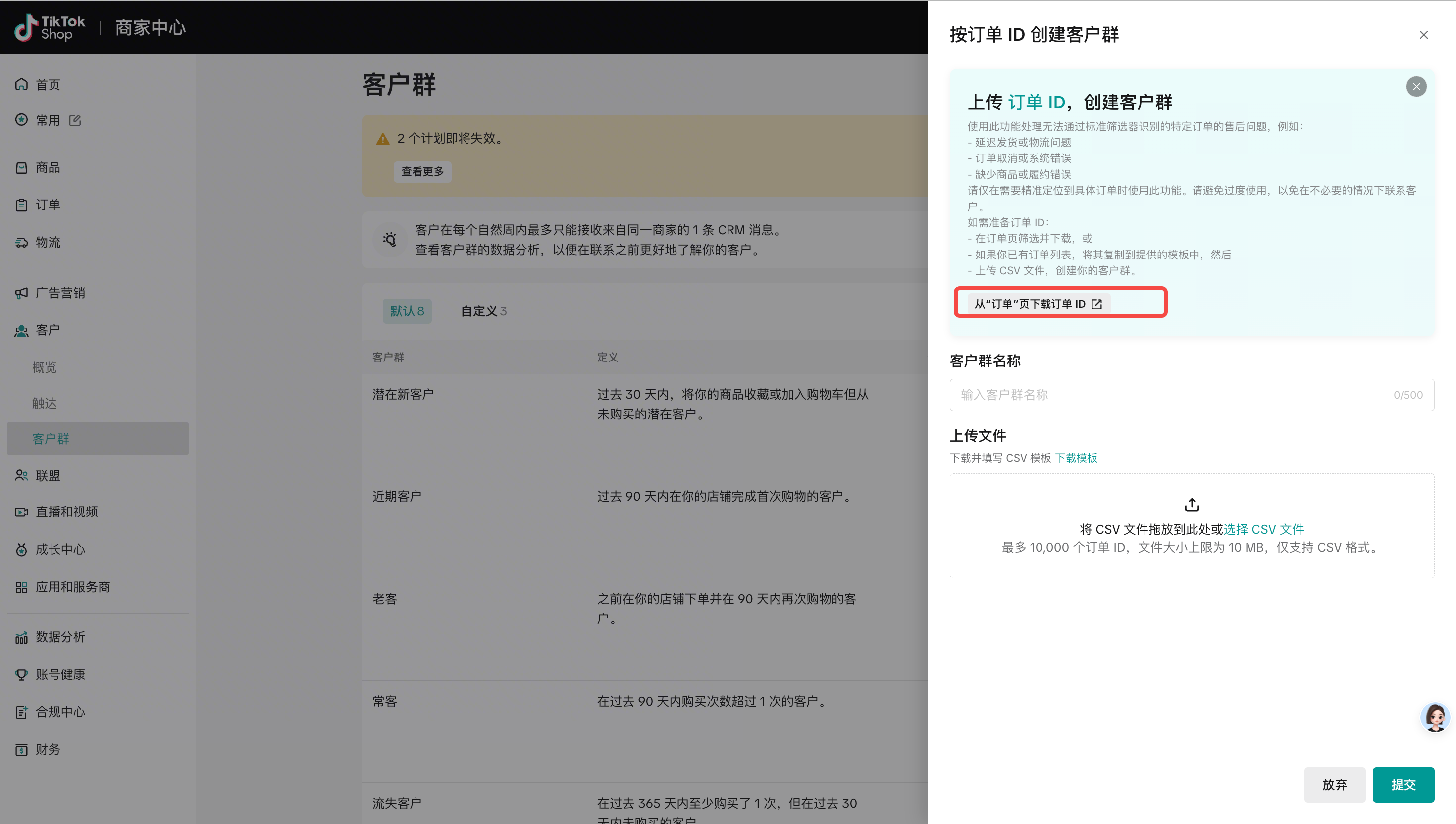 支持按订单ID创建客户群: 前往【客户-客户群】,点击【按订单ID创建客户群】-【从”订单”页下载订单ID】将打开新的订单页,可添加订单时间、状态、物流等多种筛选方式,导出为csv文件后,返回至创建客户群上传即可。系统将自动校验订单有效性并映射到下单用户,生成可用于后续消息触达的自定义人群包。