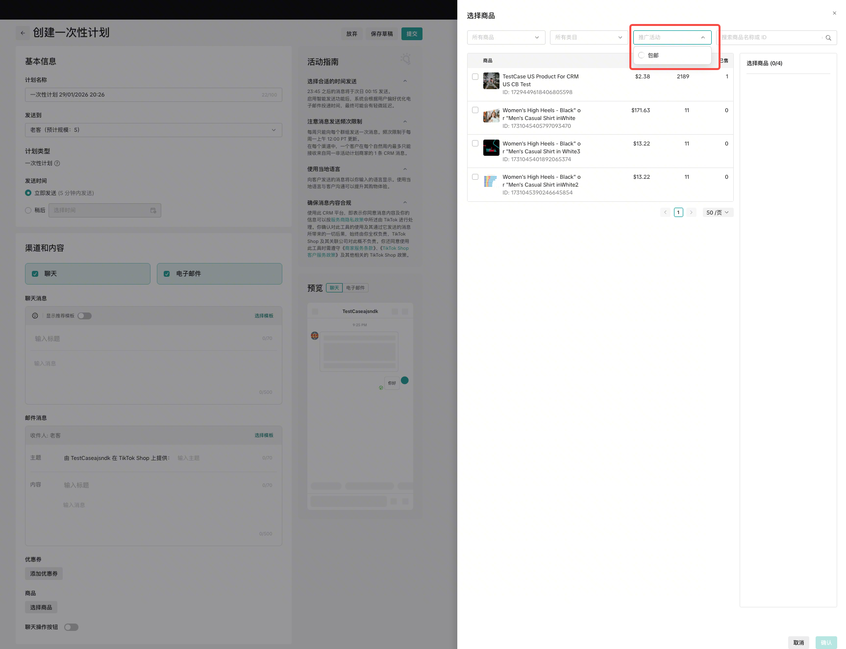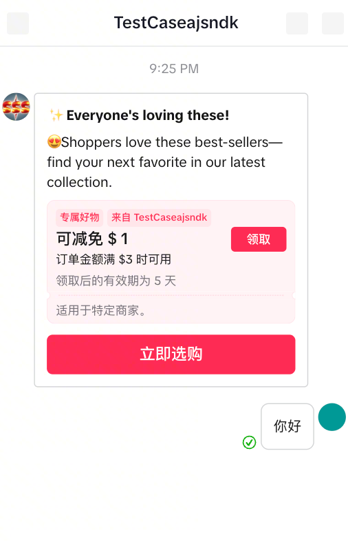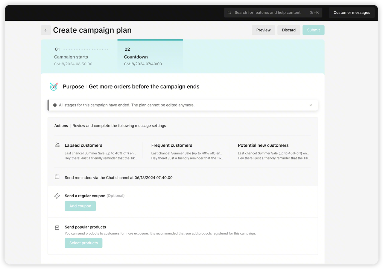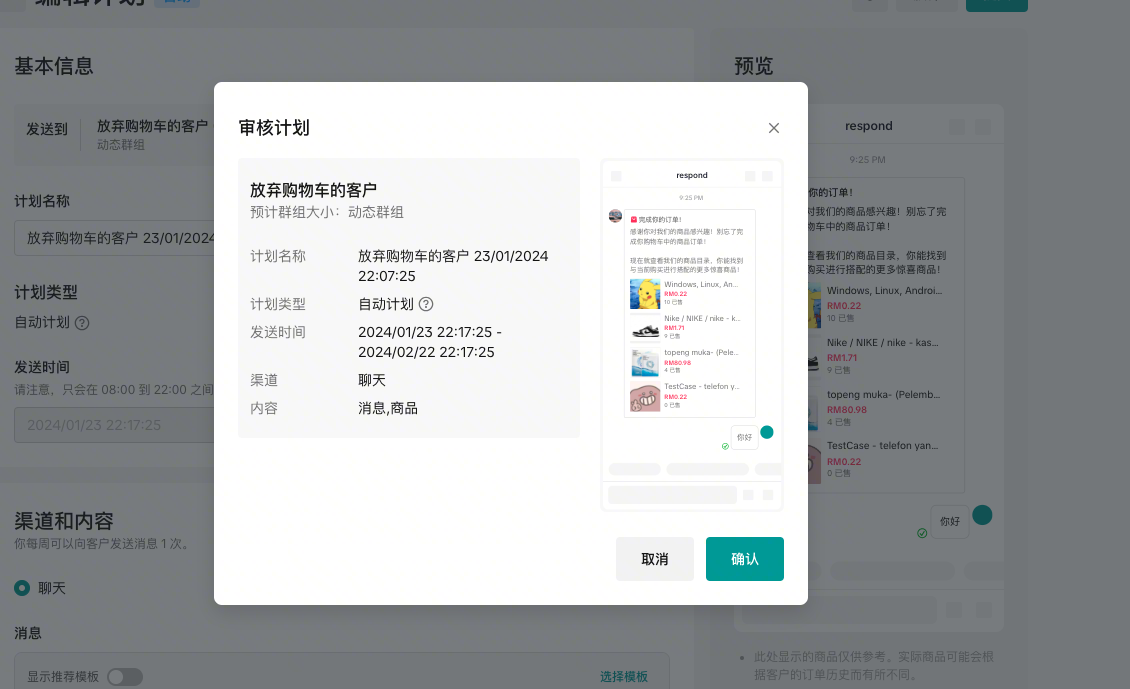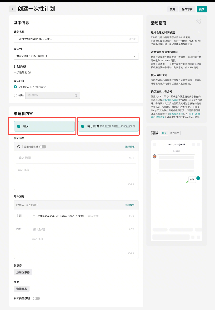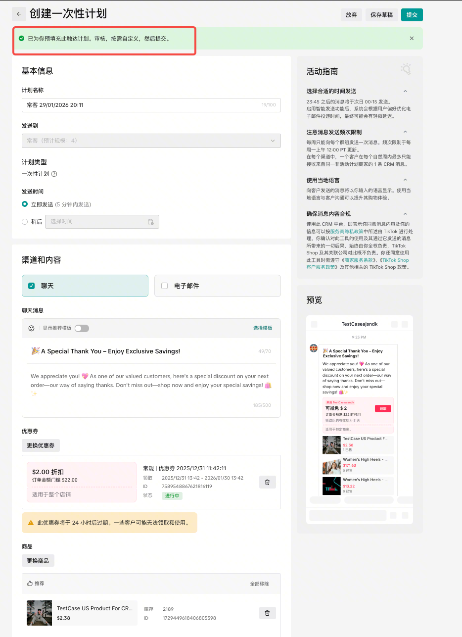 在 管理你的促销活动 创建CRM计划后,将根据优惠券类型圈选触达人群,并预填写触达文案(仅支持聊天渠道)