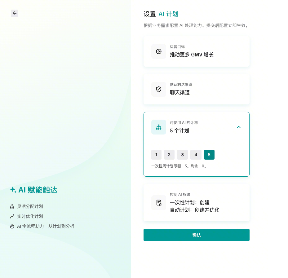 点击 客户 – 触达 – AI赋能触达 即可开启智能托管。使用托管后,AI将以 推动GMV 增长为目的,托管 聊天 渠道的CRM触达计划,以每周的数据创建、更新CRM触达计划。AI托管计划数由您的可发送计划额度决定。(您可以随时暂停您的托管)