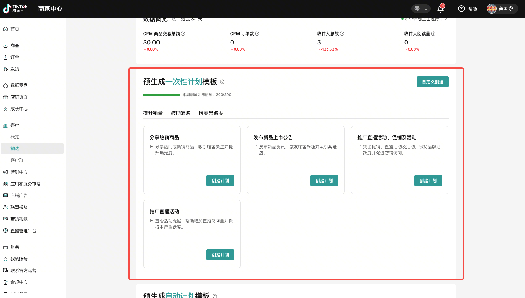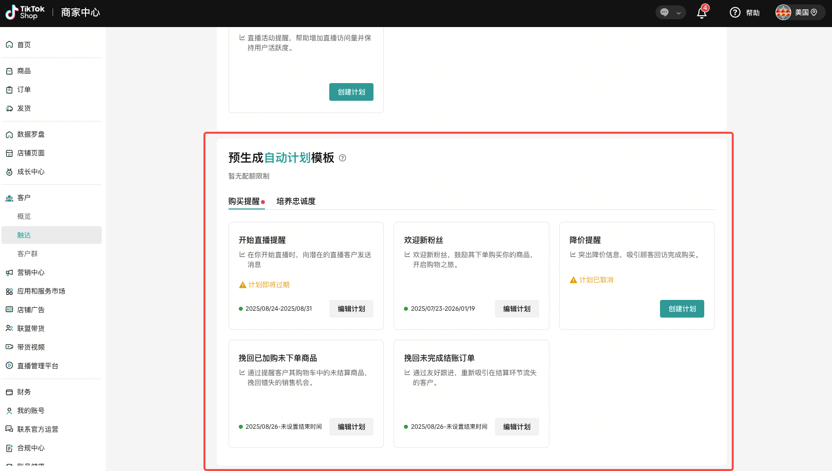- 通过点击“创建计划”为各种场景创建专用的消息模板。通过点击“创建计划”,卖家可以进入“创建计划”页面,开始为特定场景创建触达计划。