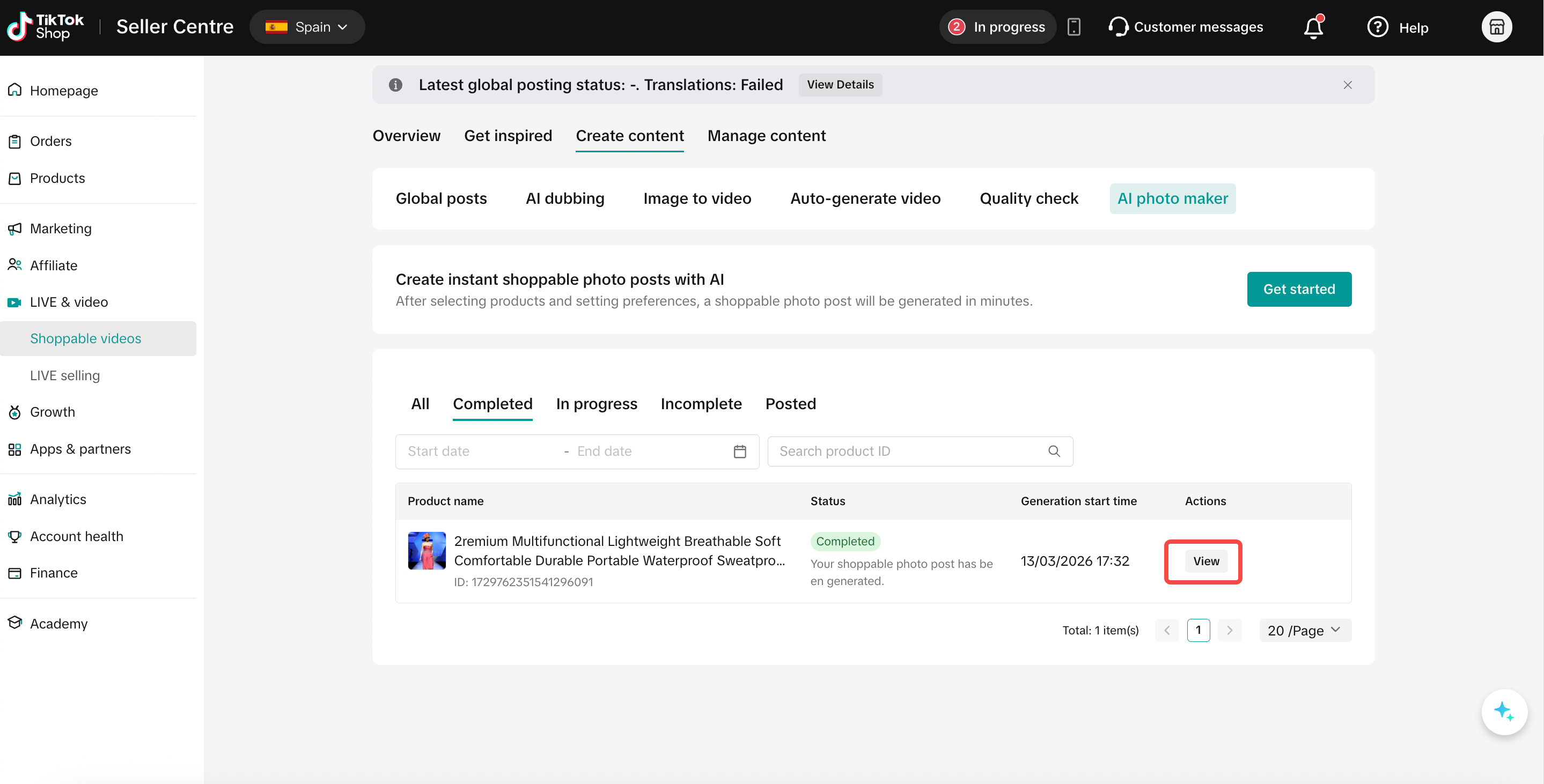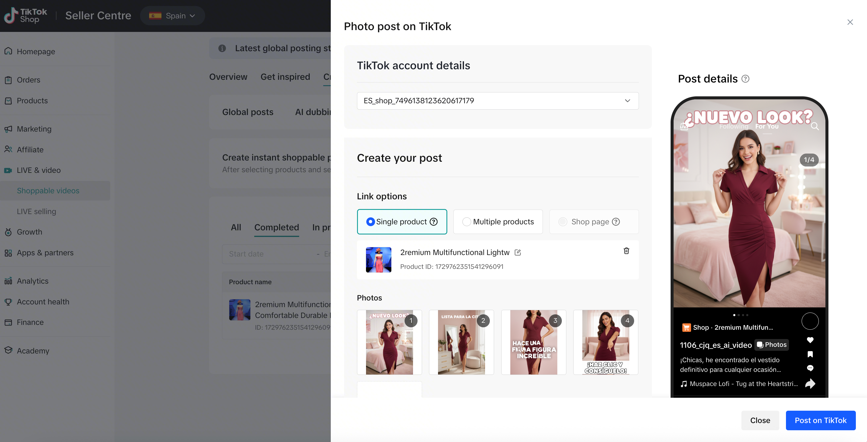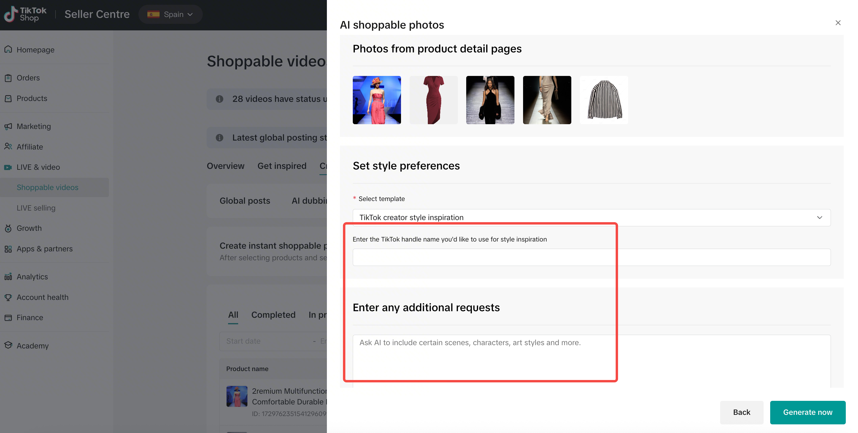 | 入口 商家中心 → 带货视频 → 创建内容 → AI图片生成器 | 发布: 选择商品 → 设定风格偏好 → 输入补充要求(可选)→ 立即生成 | 审核与发布: 1. 您可查看内容生成状态。生成完成后,点击查看按钮进行审核并发布。 – 可输入TikTok账号作为风格参考(AI将学习该账号的内容风格)。 – 若不填写,AI将学习您自身的内容风格。 – 您还可以添加补充要求(提示词),以指定所需风格。 2. 标题、话题标签及音乐也将自动生成。 3. 您可选择是否开启AI生成内容标识。 | 查看效果 带货视频 → 内容管理 → 图片 |