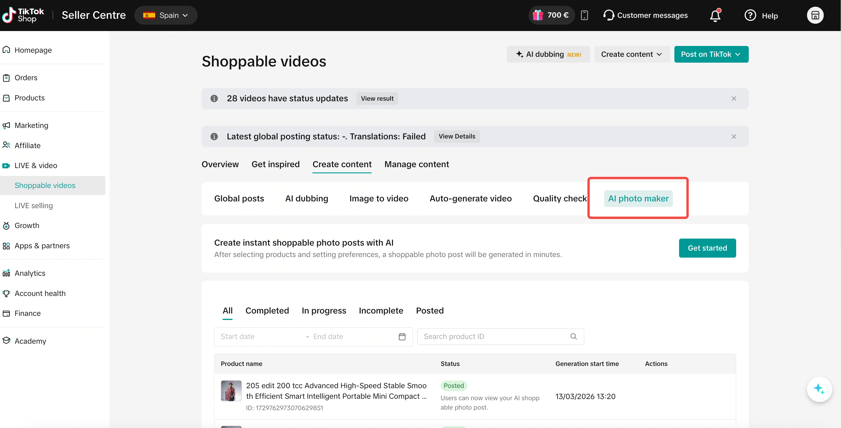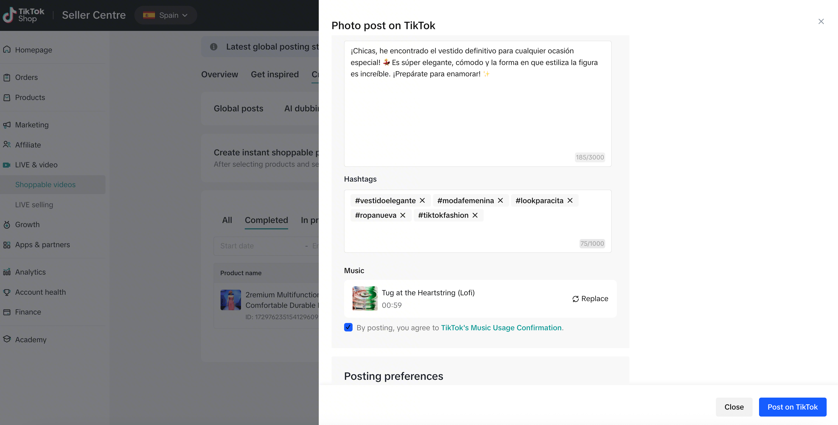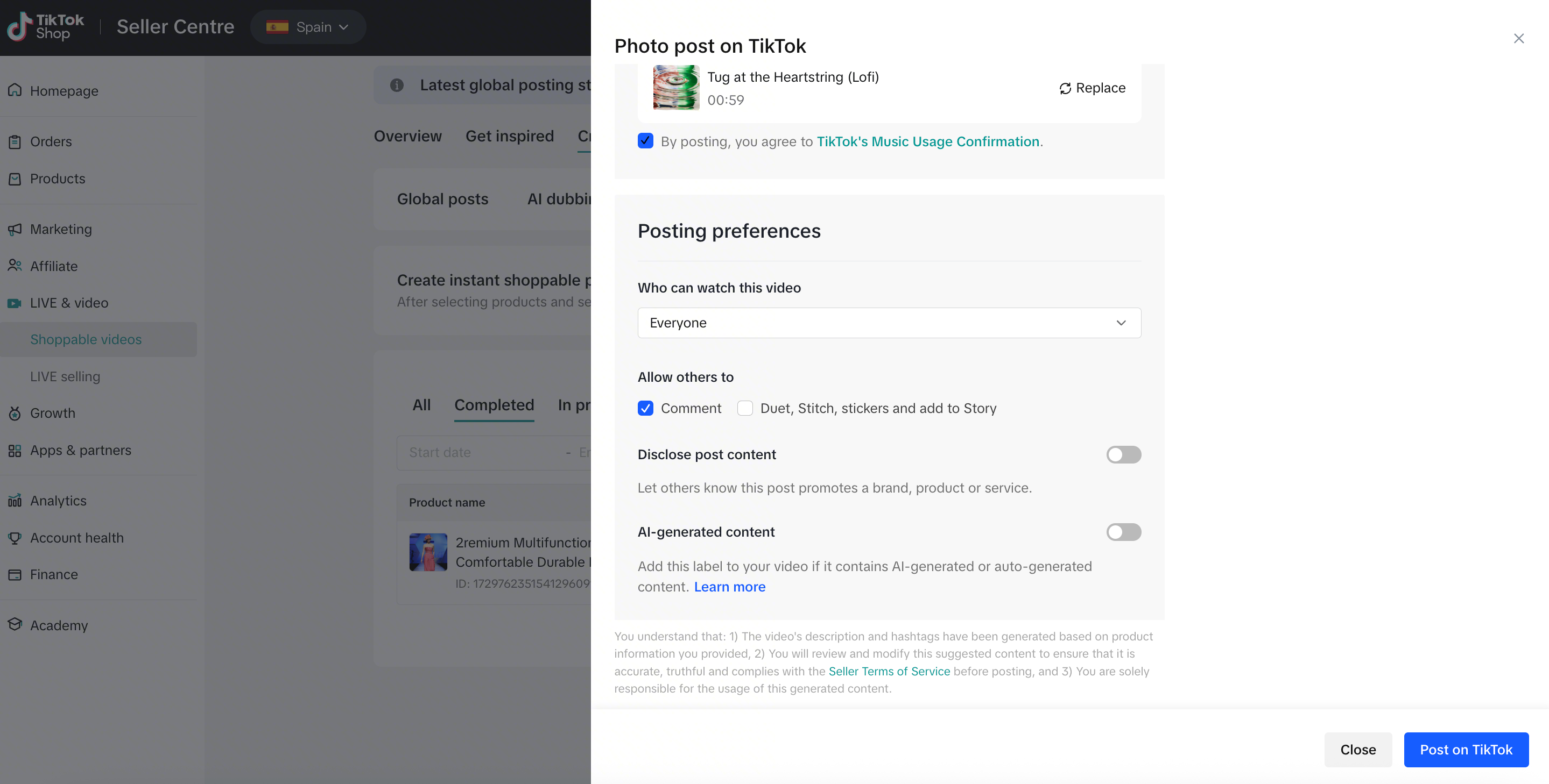 | 入口 商家中心 → 带货视频 → 创建内容 → AI图片生成器 | 发布: 选择商品 → 设定风格偏好 → 输入补充要求(可选)→ 立即生成 | 审核与发布: 1. 您可查看内容生成状态。生成完成后,点击查看按钮进行审核并发布。 – 可输入TikTok账号作为风格参考(AI将学习该账号的内容风格)。 – 若不填写,AI将学习您自身的内容风格。 – 您还可以添加补充要求(提示词),以指定所需风格。 2. 标题、话题标签及音乐也将自动生成。 3. 您可选择是否开启AI生成内容标识。 | 查看效果 带货视频 → 内容管理 → 图片 |