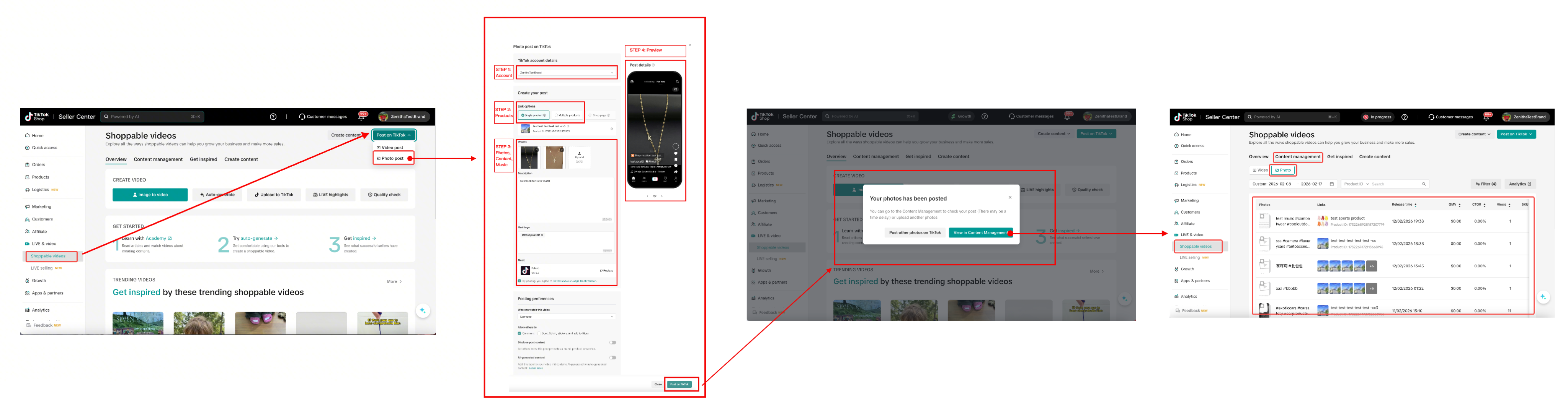 | 入口: 商家中心 → 带货视频 → 发布至TikTok → 图片发布 | 发布: 选择账号 → 选取您想推广的商品 → 制作内容(图片 + 描述 + 话题标签 + 音乐)→ 发布 → 随时查看效果以进行优化 | 查看效果 带货视频 → 内容管理 → 图片 |