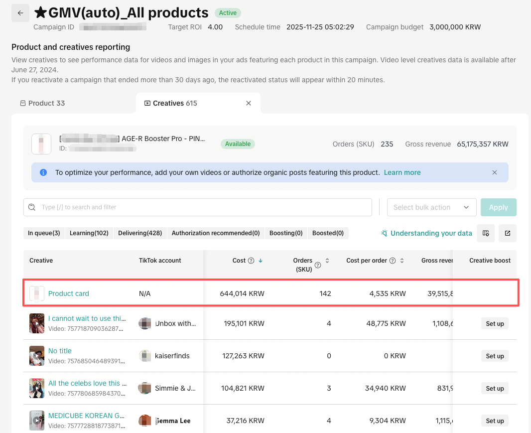 商家在GMV Max计划下为商品添加带货图片后,可在商品卡片板块查看效果数据。上线后,商品卡片的指标将同时包含来自商品卡片与带货图文的数据。请注意,视频内容专属功能(如创意助推)不适用于带货图文。
